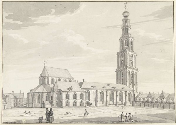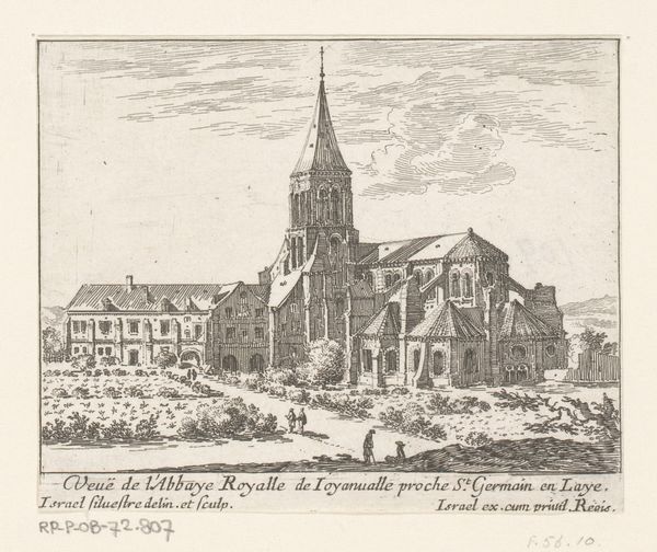 Wenceslaus Hollar created this print of Strasbourg Cathedral with etching and engraving. Dominating the composition is the cathedral's towering spire. Hollar meticulously articulates the cathedral's architectural complexity through a network of fine lines, capturing light and shadow. The sharp contrast between the dark, etched lines and the white of the paper creates a striking visual texture. The cathedral’s height is emphasized by positioning the viewer below, thus magnifying its scale relative to the figures in the foreground. This evokes the sublime, highlighting the vastness and awe-inspiring quality of the structure. The cathedral becomes a signifier of both human ambition and divine aspiration. The precise lines and detailed rendering suggest a world governed by reason, while the towering structure hints at something beyond empirical understanding. Note how this combination of minute detail and grand scale invites us to consider the interplay between earthly and transcendent realms. What meaning might arise in this juxtaposition?