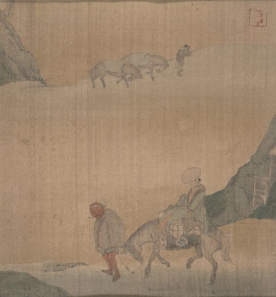 Editor: So, this watercolor painting on silk is titled "Water Buffalo," and it's an anonymous piece from sometime during the Qing Dynasty. It feels very pastoral, and the muted colors give it an almost dreamlike quality. How do you interpret this work, especially considering its materials? Curator: It’s intriguing how the artist uses watercolor on silk, media traditionally associated with refinement and high art, to depict such a common, almost quotidian scene of rural labor. The water buffalo becomes the central tool of production here. Editor: Tool of production… that's interesting. So, you’re saying that the choice of portraying labor on expensive silk challenges traditional class boundaries? Curator: Precisely! Consider the socio-economic context. Who could afford silk, and what kind of imagery was usually deemed appropriate for it? This image elevates the everyday, bringing the means of sustenance into a realm usually reserved for scholarly landscapes or courtly portraits. Editor: I see what you mean. It’s not just a pretty picture; it's about labor, value, and who gets to be represented in art. Does the repetitive use of color further this argument? Curator: Yes, notice the limited palette. It draws attention to the actual making of the piece. It feels deliberately unembellished, focusing attention on the material conditions of both the represented labor and the art-making process. It begs the question: what are they worth? Editor: So, by focusing on the materials and labor, this painting prompts us to think about the value we place on both art and everyday life. I never would have considered the art in that way, initially! Curator: And hopefully, that’s a perspective you'll carry forward. Always consider how the 'stuff' of art reflects the stuff of life.