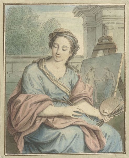 Curator: This is Rembrandt van Rijn's "Minerva," painted around 1635. Isn't she something? All glowing and deep in thought? Editor: It feels...heavy. Not emotionally, exactly, but in the way the light anchors everything. It's a weighted gaze, pulling you in. Curator: Absolutely, the baroque style emphasizes dramatic lighting and the intensity of the moment. Rembrandt had such a gift for imbuing his figures with life, even when portraying allegorical figures. Editor: Yes, she certainly holds that regal air, but Rembrandt softens the deity. It’s not about grandiosity. The open book, the muted armor...it reads more like quiet contemplation than martial prowess. Curator: Exactly! That tension between the public role, her attributes of wisdom and warfare, and the interiority that Rembrandt hints at, is brilliant. She's not just Minerva; she’s a woman embodying Minerva. The way he renders the fabrics, especially that shimmering gold cloak, elevates the piece beyond just a simple portrait. Editor: The cloak seems to drape her in history itself. There's a kind of doubling. The paint seems to have aged it with grace, enhancing the feeling of passing time. And you almost get the sensation that the helmet and other symbols that define her are all props borrowed to present that grand representation she makes to us. Curator: You know, he’s so good at portraying not just how something *looks* but how it *feels* to wear or hold. She looks a little weighed down by it all. And her gaze—she's present, seeing *us*. Editor: Indeed, breaking the fourth wall. Is it a knowing glance or a reflection on the cost of wielding knowledge and power? A lovely dance between surface and suggestion, wouldn't you agree? Curator: Precisely! Seeing this painting reminds you of the complexity and layers in what it means to depict identity, real and imagined. Editor: Indeed! And it asks so many questions from such a rich history. A beautiful piece overall.
