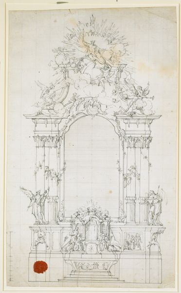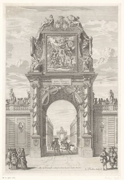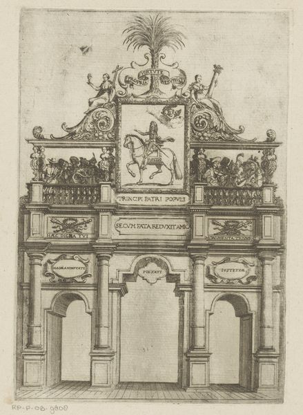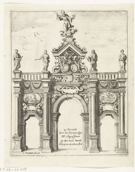 Curator: Here we have an etching and engraving by Emile Pierre Maria Spruyt, created in 1872. The piece is titled "Diploma van Maatschappij de Vrienden der Doofstommen te Antwerpen met bovenaan een portret van Charles Michel de l'Epee"—quite a mouthful! Editor: My eyes are immediately drawn to the architectural elements. The arch, the columns…it gives such a sense of formality, almost like a stage setting for a historical event. The precision of the lines, too. Curator: Indeed. Spruyt was depicting the diploma issued by the Society of Friends of the Deaf and Mute in Antwerp, topped by a portrait of Charles Michel de l'Epee, a pioneer in deaf education. The visual language employed suggests that the organization wishes to be taken seriously and for the certificate to look of the highest standard. Editor: It's interesting to consider the materials, isn't it? Printmaking allowed for the widespread dissemination of this document. To have it mass-produced meant the organization’s message reached a broad audience. The textures created with etching and engraving must have demanded very specific skills of labor. Curator: Absolutely, and the choice of etching and engraving connects the work to a well-established tradition of academic art, giving legitimacy to both the Society and its mission. Editor: And it shows how a document of recognition becomes an artwork itself, celebrating both achievement and the skill involved in its creation. There’s also that contrast between the sharp, precise architecture and the looser, more fluid depiction of the figures below. Curator: That juxtaposition speaks to the values the Society likely sought to embody: combining reason, order and care for those who had been previously marginalised. It’s also worth considering the social role of institutions like this in 19th century Antwerp. The representation here seeks to align the society with benevolence and tradition. Editor: Looking at it with a modern lens, though, it’s a potent reminder of how societal attitudes have evolved. The visual formality does have an aura of exclusion. Curator: Perhaps, but considering the context, it’s a fascinating window into a specific moment and mindset around deaf education and social progress. Editor: Definitely, thinking about this work and the choices of the artist—its means of production and consumption—highlights an under-appreciated aspect of social history, wouldn't you agree?