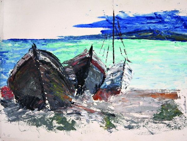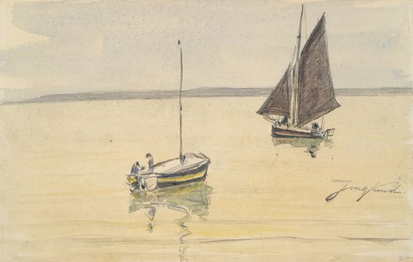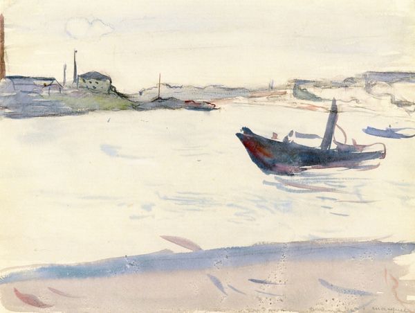 Editor: This is Maria Bozoky's "Quietness on the Ocean" from 1992, rendered with watercolor. It’s incredibly evocative, almost dreamlike. What I find immediately striking is how she's used what appears to be simple strokes of the brush, to portray such complexity of the ocean, sky, and vessels. What do you see in this piece? Curator: The materiality speaks volumes. Watercolor, often relegated to preliminary sketches, elevated to capture this scene is, I find, fascinating. This tells me that the traditional hierarchy separating "high art" like oil painting and more "humble" practices such as plein air or watercolor, were subverted. How does that make you consider the value she assigns to the labor of open-air painting? Editor: That's an interesting point. It sounds like plein-air painting could be looked down upon due to it being about ‘mere’ experience or observational rendering, as compared to studio work where the "real art" supposedly takes place? Curator: Exactly. We have to understand the artist's conscious choices – the embracing of the "quick," of working *directly* from nature, which emphasizes her agency. Consider how this reflects her personal consumption patterns in terms of material, in relationship with those social expectations. What did these painting materials represent during that time period? Editor: I imagine access and availability probably mattered. Watercolor materials are traditionally far less costly than those used for oils or other processes, which probably broadened who was creating landscape paintings at this point. Curator: Precisely! And this potentially democratizes not just art making, but representation of everyday locations or observations as an artistic practice. Editor: I see how a 'simple' watercolor on the ocean quietly challenges these well established social art structures, when seen from a materialist viewpoint. Curator: Indeed. By consciously using these more accessible materials and techniques, Bozoky might very well have been making a conscious choice about the statement her work communicates about art, its creation, its economic associations.