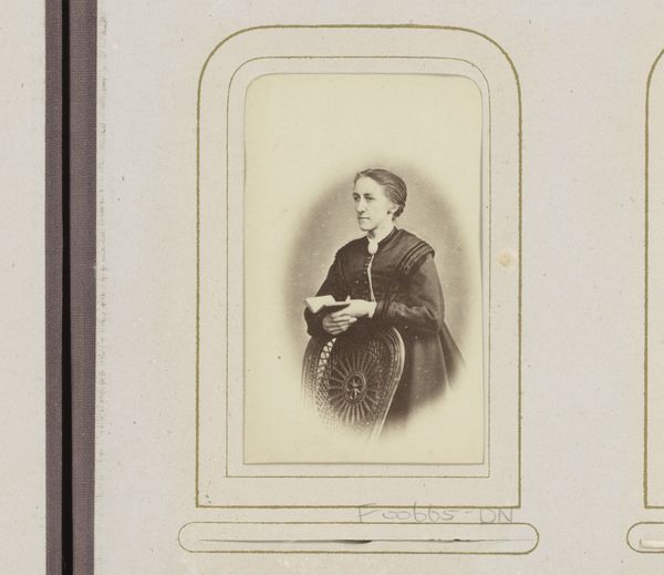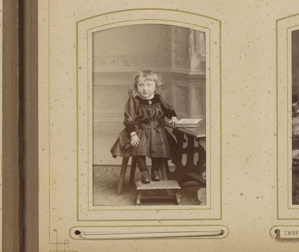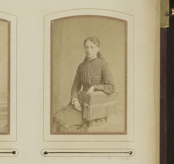 Curator: We’re looking at “Portret van een meisje, leunend op een stoel met bont,” a photograph created sometime between 1860 and 1900, attributed to Debenham & Gould. Editor: It's arresting, isn't it? The slightly faded tones lend a melancholic air. The girl seems to be looking right through me. Curator: Absolutely. This photograph gives us a window into the studio portraiture of the late 19th century. The presence of the fur and the somewhat rigid pose point toward a performance of class and status. This reflects the societal pressures of the time where photography served as both an object of personal memory and a public declaration of identity. Editor: I wonder about the girl's perspective, though. Was she complicit in this performance? Or a reluctant participant in a symbolic tableau representing Victorian ideals of womanhood? The tight dress seems restrictive, her grip on the fur, perhaps unconsciously conveying a sense of discomfort. Curator: That's an astute observation. These types of formal portraits had very rigid gendered norms. Middle to upper-class girls were expected to represent themselves in very particular ways. Elements such as attire and pose underscored not just wealth but decorum and femininity. Editor: The staging here, in particular, fascinates me. It's as if the photographer wanted to convey not just the image of a specific individual, but also, to offer the era's aesthetic sensibilities for constructing feminity itself. Is this an individual being portrayed, or an idealized vision projected onto an anonymous young woman? The lack of personalization draws an emphasis on her presentation, like a living doll encased in the perfect setting of the oval frame. Curator: I completely agree, and the photograph exists now as this layered thing. On the one hand, it gives us the opportunity to look at the social history of the image. And at the same time it poses complicated questions for modern viewers of thinking about issues of gender identity as performance, self-representation, the role of clothing, and the cultural norms related to beauty standards and the cultural expectation of youth. Editor: Yes, despite the apparent stillness and conventionality of the piece, I think what strikes me most is its continued potential to stir up dialogues about historical versus contemporary images of girlhood. Curator: Exactly. I appreciate that we can view historical photography not just as a preserved memory, but as an archive that provokes vital critical dialogue about representation, identity, and power.