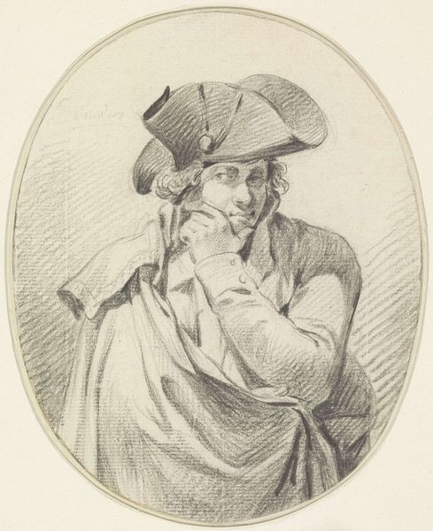 Editor: Here we have Ludwig Gottlieb Portman's "Portret van de man die hoefsmid was tijdens de opstand in Vendée", an engraving from 1805. The man's direct gaze is quite compelling. What strikes me is the ordinary portrayal of someone involved in a major historical event. What do you see in this piece, considering the context of the Vendée uprising? Curator: I see a potent intersection of class, revolution, and representation. The French Revolution was meant to uplift the common person, but the Vendée uprising reveals deep divisions. This portrait complicates the narrative of a unified revolution, as it presents a man who was both a common worker—a blacksmith—and a rebel. Portman's decision to portray him with such directness forces us to consider the individual stories often lost within broader historical movements. Editor: So it’s about questioning the dominant narrative? How does his identity as a blacksmith during the uprising change our interpretation? Curator: Absolutely. Blacksmiths, like other artisans, held a particular place in the social order. They weren’t nobles, but they also weren’t the poorest peasants. The Vendée uprising was fueled by a complex mix of factors, including resentment towards the centralizing power of Paris, religious fervor, and economic grievances. This blacksmith's participation underscores the multifaceted nature of resistance and the ways in which identity informed political action. How does his attire, in particular his hat, speak to this identity and resistance? Editor: Now that you mention it, his hat almost seems like a symbol of defiance or at least some form of social statement, not what you would expect from someone of the working class. Curator: Precisely! His hat signifies a localized identity, pushing against the fashion dictates of Paris and the Republic, thereby reclaiming identity. It really causes one to reflect upon resistance and identity. Editor: I see that now! I was focused on the face and forgot how even clothing choices can make a statement. It offers a different entry point into the complexities of revolution and representation. Curator: Indeed. Analyzing this portrait allows us to appreciate how seemingly simple artistic choices—the direct gaze, the inclusion of his tools, the detailed engraving of his clothes – all contribute to a richer understanding of this pivotal historical moment.