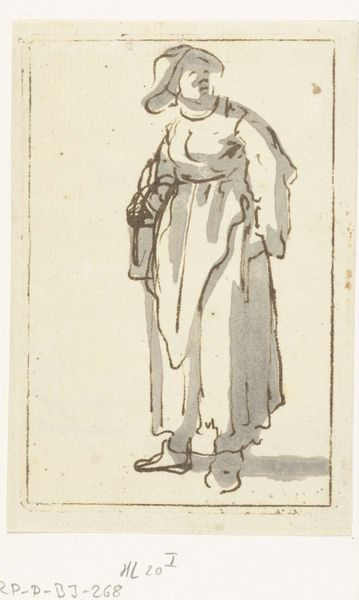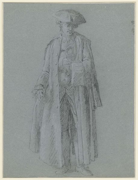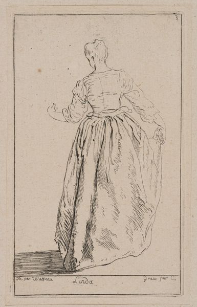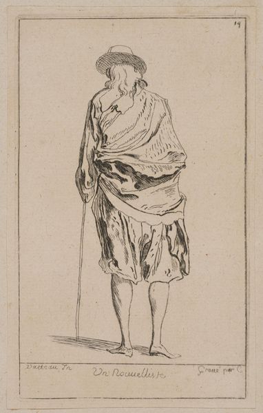 Curator: My first impression is one of nonchalance, the figure's posture and expression suggest an almost theatrical disinterest. Editor: This is "Le beau Cléon," an etching by A. Claude Philippe de Thubières, comte de Caylus, currently residing at the Harvard Art Museums. Its dimensions are quite modest, only about 15 by 9 centimeters. Curator: The line work is fascinating, almost scribbled in places, yet it defines the texture and form of the clothing remarkably well. There's a tension between precision and spontaneity. Editor: Indeed. Caylus was a key figure in the 18th-century art world, known for his antiquarian interests and influence on artistic taste. This image speaks to the prevailing social ideals of masculine elegance and aristocratic identity. Curator: Note how the cape drapes, creating diagonal vectors that intersect to form a complex visual dance, all rendered with a minimum of marks. Editor: And the title itself, "Le beau Cléon" – "The handsome Cléon" – suggests an engagement with contemporary theatrical characters and the performance of self. Curator: Ultimately, this work serves to investigate the line and its capacity to define not only form, but mood as well. Editor: A lens through which to consider how identity was actively constructed and circulated through visual culture in 18th century France.