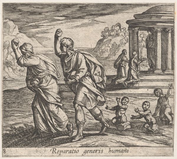 Curator: Here we have Adriaen Collaert's engraving, "The Banishment of Hagar and Ishmael, from The Story of Abraham," dating from around 1584-1585. Editor: My immediate impression is one of controlled chaos, perhaps a Baroque sensibility contained within tightly wound lines. The light and shadow create so much dynamism, and even with so much negative space, my eye hardly finds a place to rest. Curator: Absolutely. Consider how the linear precision carries the narrative weight. Collaert presents Hagar’s story – she was cast out into the desert with her son Ishmael by Abraham at the insistence of Sarah, Abraham's wife. This banishment marks a pivotal moment of both heartbreak and perceived destiny. You notice the domestic busyness to the right with an outdoor forest to the left – it presents an allegory of a departure from comfort, as God protects them. Editor: The composition uses a distinct split; Hagar and Abraham are in this tight center stage, rigidly postured – with a somewhat softer focus on figures moving and reaching. You might also notice that, rather strikingly, there's only a sort of visual barrier formed in the landscape by trees between the classical or biblical subjects, versus something less easy to name. Almost theatrical… Curator: And notice how Hagar is led away – with the hand held at center stage. Abraham, in almost protective body language, shields Hagar’s chest area; at the same time, his words indicate otherwise as she goes with the waterskin hung over her shoulder. These stark contradictions appear so much across similar engravings. Consider Sarah's power dynamic playing out at this precise moment. It is like Sarah casts Hagar and Ishmael out from the very door we are all on the threshold of. Editor: You read a great tension between detail and abstraction, in this reading, I find some affinity between both landscape backdrops and both figures at center, which provides insight, both to Hagar's exile, and our point-of-view into this family struggle. Curator: Yes, and knowing these were intended as printed reproductions – so a multiplication and distribution of moral lesson…that interplay of light, and dark really digs deep. Editor: A stark narrative told in stark lines. The formal construction emphasizes a psychological drama frozen in a moment of exquisite and agonizing tension. Thank you, Curator. Curator: And thank you. Exploring the human stories intertwined with cultural legacies keeps these historical narratives alive.