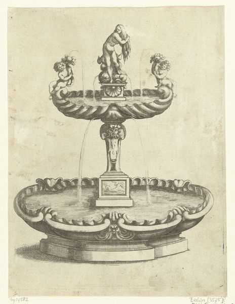 Editor: So, this engraving, "Fontein met twee waterbassins," dates back to between 1680 and 1707. It's rendered with incredible detail in line and shading. The baroque style lends a theatrical flair, and the structure of it—the perfect symmetry and geometric design—impresses me the most. What compositional elements stand out to you? Curator: Indeed, the architectural precision is captivating. Notice how the anonymous artist meticulously organizes the space with geometric forms. The fountain's levels progress from a broad, stable base to a delicate, figurative apex. The rhythm established by the repeating balustrades and the circular basins creates a visual harmony. How does this systematic arrangement influence your perception? Editor: I think it emphasizes the careful control and balance inherent in the design. The statue at the top creates an apex and a dynamic point. Without that apex, I don't know if the composition would succeed. Curator: Precisely. This verticality, culminating in the figural group, invites the eye upwards, accentuating the fountain's height. Furthermore, consider the linear quality of the engraving. The precise strokes and cross-hatching define the forms and create a sense of depth. Do you observe any tension arising from the interplay between line and volume? Editor: I see it, now that you point it out! The starkness of the lines and sharp geometrical qualities create the tension you describe. So, rather than a celebration of free-flowing, natural beauty, the artwork emphasizes artifice. Curator: Yes, it invites contemplation on the ideals of form and representation in art. Editor: Thanks! Looking at the relationship between line and depth helped me better understand the artistry.
