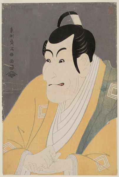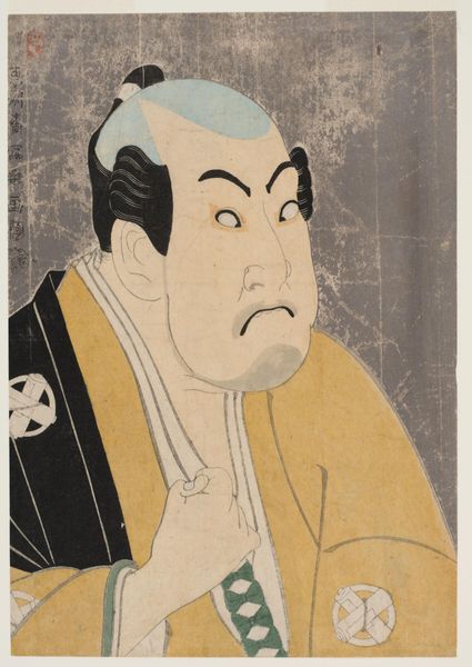 Editor: This woodblock print from 1795 by Tōshūsai Sharaku is called "Ichikawa Danjūrō VI as Arakawa Tarō Takesada." The texture looks interesting; you can almost feel the grain of the wood. What do you notice about the materials and production of this work? Curator: As a materialist, I'm drawn to the socio-economic context in which this print was made. Ukiyo-e like this one were produced for a growing urban class. They were relatively inexpensive and accessible. Consider the labor involved: the artist, the woodblock carvers, and the printers. Editor: So it's a kind of mass-produced art, meant for regular people? Curator: Exactly! These weren't unique, commissioned pieces. They reflect the tastes and consumption patterns of Edo-period Japan. The woodblock printing technique itself, a mechanized reproducibility if you will, democratized art. This print’s caricature, for example, is less about the individual and more about accessible theater types, and therefore, accessible entertainment for the public. Editor: I see, so the way it was made and who it was made for are as important as who it depicts? Curator: Precisely. This is where traditional divisions of "high art" versus "craft" crumble. Think of the materials themselves – wood, ink, paper – transformed through labor and technology into something with social and cultural meaning. What stories do the colors and the composition of the garments tell you about the class that produced the print and the class that could afford to purchase the work? Editor: That makes me see it in a totally different light. Thanks! Curator: Indeed. By considering the process of production and the social context, we gain a much richer understanding of this print’s place in history and how cultural significance evolves in response to materials and accessibility.