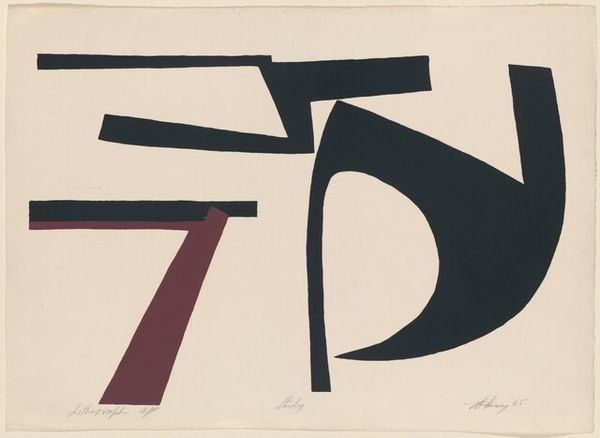 This is a lithograph made by Mavis Pusey in 1963. It's all about process, seeing how shapes interact, push and pull against each other. Look at the way Pusey uses these bold, black shapes against the white of the paper. There's no messing around; it's direct and confident. It makes me think about architecture, maybe buildings seen from above or blueprints for something that hasn't been built yet. Notice that slanted rectangle on the bottom right. It feels like it's sliding or maybe about to take off. Pusey's work reminds me a bit of Frank Stella's early black paintings. Both artists are interested in how simple forms can create complex relationships. But where Stella is cool and detached, Pusey feels more intuitive, more like she's playing with the shapes. It's a conversation, a dance of form and space. And like any good conversation, it's full of possibilities.