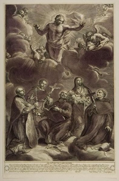 Curator: This is "Five Saints Kneeling and Adoring Christ," an engraving dating from between 1666 and 1676 by François Spierre. Editor: It’s striking how the artist used light and shadow; that contrast immediately grabs you. It's got this otherworldly, dramatic flair typical of the Baroque era. The sheer volume of figures feels almost overwhelming, doesn't it? Curator: Precisely. The composition leverages a clear hierarchical structure: Christ dominates the upper register, surrounded by angels and bathed in divine light, while below, five saints—Francis Borgia, Louis Bertrand, Cajetan, Rosa of Lima, and Philip Benzi—are arranged in a semi-circle, united in devotion. Notice the linearity, typical for engravings, how that contrasts with the billowing, almost operatic cloud formations. Editor: The symbolism is quite dense. Each saint carries emblems that point to their life, works, and particular spiritual attributes. It makes one consider the emotional resonance of sainthood during that era; were they examples of piety, intended to inspire or perhaps elicit feelings of guilt and awe? Curator: It delves deeper. The arrangement subtly orchestrates visual narratives around redemption and divine grace. Each element within the pictorial space relates through form and association, not just illustrative function. Observe how Spierre used light not just to highlight, but to create a sense of spatial depth. The stark lines, combined with strategic shading, construct this divine landscape with great intention. Editor: You're right, the medium itself reinforces that intentionality. As an engraving, the precision emphasizes theological doctrine while using dramatic visual language, aiming to shape how viewers interpret sanctity. The halo effects are less about literal representation, more about invoking specific theological feelings. Curator: I find myself considering how effective it is. To what degree did its formal choices enable specific devotional experience? And how does this relate to its cultural milieu and patronage? Editor: Pondering the relationship between form and spiritual function is vital. Ultimately, Spierre's decisions offer insight into that period’s complex ways of seeing—both worldly and divine. Curator: I concur; revisiting works like these reminds us of the sheer effort to visually translate faith during times of intense change and conflict.