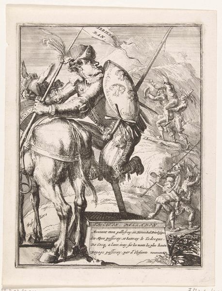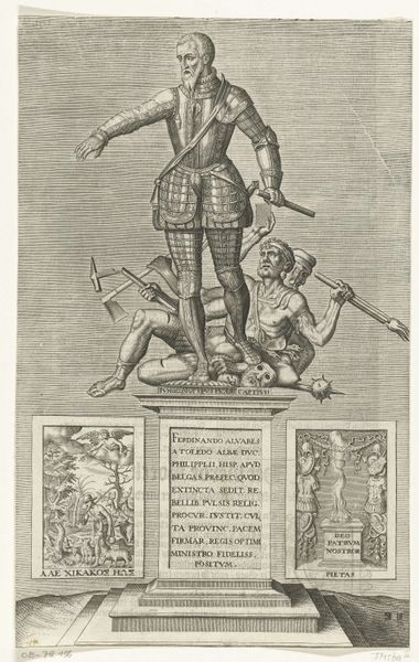 This engraving shows a statue of Ferdinand de Toledo, the Duke of Alva. It was made anonymously. The image is of the Duke standing triumphantly on a pedestal, trampling defeated figures. The print was made during a time of intense religious and political conflict in the Netherlands, then under Spanish rule. Alva was a key figure in the Spanish suppression of the Dutch Revolt, a brutal campaign that earned him lasting notoriety. Prints like this were tools of propaganda. The Latin inscription praises Alva as a restorer of peace and a faithful servant of the king. Yet the graphic depiction of Alva standing over the subjugated people suggests a more complex, and darker, interpretation. By looking at pamphlets, chronicles, and other visual materials from the period, we can begin to unpack the ways in which images were used to shape public opinion and legitimize political power. The meaning of the statue is contingent on the historical, social and political context in which it was made.