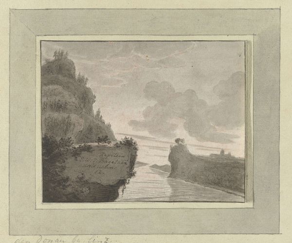 Curator: Henricus Wilhelmus Couwenberg created this engraving, "Gezicht op de Hunneschans bij Doorwerth met in de verte de Eusebiuskerk te Arnhem," around 1838. Editor: It evokes a deep sense of solitude. The muted tones create a somber, almost dreamlike atmosphere, while the silvery moonlight casts elongated shadows that enhance the overall feeling of melancholy. Curator: The choice of landscape and the time aligns perfectly with the rise of Romanticism in the Netherlands. It speaks volumes about Dutch national identity at this time and its fascination with historical locations and symbolism after French occupation. The couple shown almost blends in as an additional layer in this idyllic national vista, don't you think? Editor: Agreed, the human figures are rather small against the dominating scale of nature and history. Their positioning almost seems to provide depth to the work, acting as a bridge for our eyes from the detailed foreground into the expanse. The moon sits high up, yet the use of lighting and shade creates distinct foreground and background compositions. Curator: Couwenberg strategically positions us on the Hunneschans, which allows viewers a privileged viewpoint—literally standing on the past looking toward the present and the promise of Arnhem’s future as the distant Eusebiuskerk looms far in the background. Editor: It’s fascinating how Couwenberg masterfully balances intricate details like foliage textures and clothing against the vastness of the landscape. Look at how different and well defined the treatment of the moon is with its cloud backdrop, each precisely defined to give a balanced light throughout the work. Curator: That speaks to Romanticism and its emphasis on the sublime. Even in engraving, we feel that power of nature over human endeavor. Think of how that resonated then: feelings about nationalism, historical reflection and resilience of the Dutch identity would permeate any contemporary audience! Editor: For me, what resonates is that delicate interplay of textures and composition that evokes a sense of quiet contemplation. The visual narrative allows space for the viewer to just dwell within its gradations of gray and silver and create their own interpretations. Curator: And hopefully, with some historical context, be aware of that broader story as well. Editor: Precisely; It’s a beautifully structured and thoughtful creation.