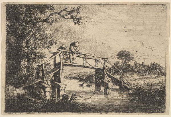 Editor: De Wint’s watercolor, "Bridge over a Branch of the Wytham, Lincolnshire", feels like a snapshot of quiet rural life. What lasting symbols do you see present in this landscape? Curator: Consider the bridge, not merely as architecture, but as a symbol of connection and transition. Water, a symbol of renewal and the subconscious, reflecting both the bridge and the woman. What emotional weight does this scene carry for you? Editor: It feels timeless, a scene repeated across generations. Curator: Exactly. The bridge, the water, the laboring figure–they represent continuity. How might this image speak to anxieties about change and loss of simpler ways of life? Editor: It is a powerful reminder of the past, and how we are connected to it through these enduring symbols. Curator: Indeed, a visual echo, preserving collective memory.