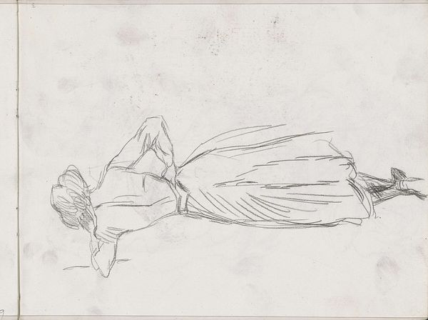 Curator: Before us, we have a pencil drawing by Victor Müller entitled "Die Richard III. heimsuchende Prinzessin Anne, als männlicher (_) Akt," currently held at the Städel Museum. Editor: It’s striking. Stark, even. The pose seems vulnerable, and yet the androgynous, almost careless rendering exudes a subdued power. Curator: Exactly. Focusing on the material, it’s evident that Müller utilizes the pencil with deliberate simplicity. Look at the economy of line, how he captures form and gesture with such minimal effort. The laid paper adds to this feeling. We see no furious artistry at work here, nothing precious. This suggests a process more about working through form and anatomy and less about finished presentation. Editor: But this apparent simplicity belies its complexity. To cast Anne, the grieving widow of Richard's victim, as a nude male figure is to destabilize traditional representations of power and mourning. It begs the question of masculine authority over historical narrative. Think about the male gaze often applied to portrayals of women and how that’s complicated here. Curator: And consider the paper itself – its ready availability signifies art for exploration and instruction rather than something monumental. Perhaps a study done to develop another idea. Was there an ease of material and its implications? Its accessibility might denote something about artistic communities and instruction that other forms of media and support wouldn't reveal? Editor: Precisely. This speaks volumes about how identity and historical trauma were being re-evaluated. And isn’t it a challenge to those historical and literary interpretations that frame women solely through their relationship to male power? It provokes discussion around the constructed nature of gender itself. Curator: Agreed. This drawing compels us to consider how something as seemingly simple as pencil on paper can be charged with artistic, material, and sociopolitical questions. It prompts inquiry into artistic development within shifting production contexts and how artworks and sketches are used, exchanged, valued. Editor: Ultimately, this artwork becomes a powerful statement about the complexities of gender, power, and the way historical narratives can be manipulated and reclaimed.