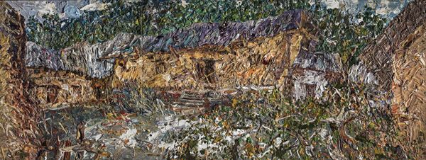王新福 created this painting of an abandoned house using what looks like thick daubs of oil paint, as if the making of the painting was like building something from the earth. Up close, the texture jumps out at you. It’s rough, with each stroke distinct, almost like little bricks forming a wall. The colors are earthy – browns, ochres, and grays – but punctuated with these surprising pops of blues, yellows, and greens. There's this one spot, near the top right, where the paint is built up so high it casts a shadow. It's like the artist really wanted to emphasize the physicality of the paint, the materiality of the medium. This approach reminds me a bit of Van Gogh, but maybe with less drama and more quiet contemplation. Like Van Gogh, Wang understands art as an ongoing conversation, always building upon what's come before, always searching for new ways to see and feel the world.