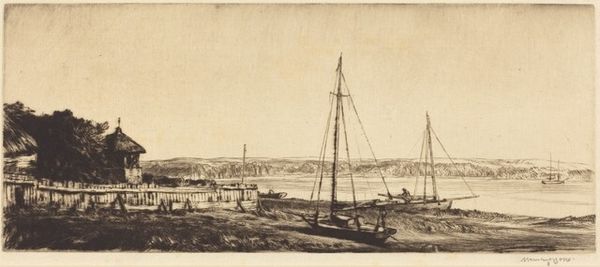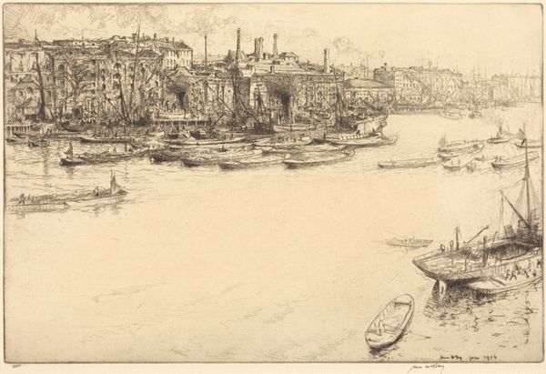 Curator: This drawing, titled "The Jersey Shore from Riverside Drive," is by Muirhead Bone. Look closely at the details rendered simply with pencil and pen. Editor: Immediately, I’m struck by the sketch-like quality and the somber mood. It feels unfinished, or maybe that’s just the effect of the industrial subject matter softening into a tonal landscape. Curator: It does feel intimate, almost like glimpsing a page from the artist’s personal sketchbook. The industrial elements—smokestacks and cranes—become almost quaint when observed with such a sensitive eye. Think of the history imbued in images of harbors—departure, arrival, and all the labor associated with that. Editor: Exactly. The boats feel packed, maybe overcrowded? I keep coming back to how that feels connected to turn-of-the-century immigration patterns. It’s subtle, but these visual choices carry weight. Were the conditions ideal for those dock workers? What’s often left out of "landscape" imagery, specifically as it concerns those who dwell and occupy its social peripheries? Curator: Bone's use of line is so fascinating, isn't it? How the pen work describes form with an economy of means. Look at the foreground textures against the misty background. Consider the symbol of water itself as transition or transportation... It's about capturing not just the appearance but the underlying energy. Editor: Absolutely. Even the very choice of medium – the pencil sketch - feels loaded, suggesting an immediacy and rawness that oil painting of that time period just didn’t attempt to achieve, and certainly not when dealing with this type of social-realist imagery. Bone could be pushing back against those accepted art forms of the time and asking his own set of nuanced questions. Curator: Thinking about what it meant to create urban landscapes in sketchbooks, we circle back to something like a private journal – documenting change, progress, and a bit of melancholy. Editor: Melancholy, yes. But also potentially speaking to our own role in this very real place and moment. This invites introspection, to consider not just what *is*, but to dream, in whatever way we can, what *could be*.