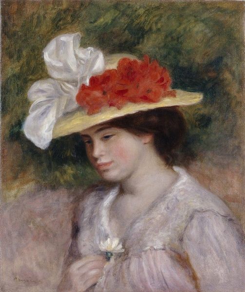 Raimundo de Madrazo painted this portrait, titled "Contemplation", sometime between the late 19th and early 20th century. Madrazo, born in Rome and trained in Paris, belonged to a family of artists, a context that granted him access to elite social circles and the art world. Portraits of women like this one were popular among the bourgeoisie, reflecting the era's emphasis on beauty, elegance, and domesticity. What strikes me here is how Madrazo captures the woman’s gaze, averted and introspective. Her expression transcends mere physical beauty, inviting us to consider her inner thoughts and emotions, even if she remains unnamed. Her clothing is both decorative and restrictive, adorned with flowers, and emphasizing an aesthetic that both celebrates and confines the female form. Madrazo, through his painterly skill, asks us to contemplate the complex interplay between outward appearance and inner life, between social roles and individual identity.