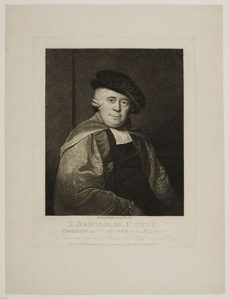 Editor: This is Valentine Green's portrait of Sir Joshua Reynolds. I’m struck by the contrast between the textures of Reynolds's clothing and the smooth, classical bust beside him. What do you see in terms of form and composition? Curator: Note the meticulous rendering of light and shadow, creating depth and volume. The composition is deliberately structured. Consider the formal relationships. Do you notice how Reynolds is positioned in relation to the sculpture? Editor: Yes, Reynolds seems to be presented as an artist equal to the classical masters. Curator: Precisely. The artist uses a formal language to elevate Reynolds. The composition reinforces his status, through symbolic alignment with classical ideals and intellectual pursuits. What did you learn? Editor: I see how the arrangement of elements and the rendering of textures serve to create a statement about Reynolds's artistic identity.