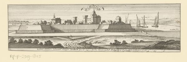 Editor: So this is "Klosbaan bij Paleis Het Loo" by Cornelis Danckerts II, dating back to between 1696 and 1718. It's an engraving. I find it fascinating how it depicts such a formal garden and palace in this almost sketch-like, simple style. What strikes you most about it? Curator: Well, immediately, the engraving speaks volumes about power and order in the late 17th and early 18th centuries. Do you notice how the Klosbaan – a type of bowling green – is meticulously arranged in relation to the Palace Het Loo? It’s a calculated display. Editor: Absolutely. It feels staged, almost like a theater set. All those figures seem so purposefully placed. Curator: Precisely! These gardens, and the activities held within them, were performative acts. Think about the symbols employed: The architecture of the Palace, with its straight lines, symmetry, and repeated windows and how they contrasts with the slightly looser rendering of nature around it, what could that say about how humans thought of the world around them? Editor: It could show man attempting to organize the natural world... maybe exerting control and dominance over nature? Curator: Indeed. Also consider the emotional landscape; a certain detachment, even stoicism, permeates the scene. This aesthetic, particularly popular within ruling circles, communicated something profound about their position and understanding of how to signal virtue and nobility. What feeling does the location elicit from you? Editor: I suppose, at first it feels kind of cold and calculated. Now though, with your insight, I better appreciate the cultural memory being built. A powerful ruling family that wants their surroundings to display order and structure to signal dominance to their subordinates. Thank you. Curator: My pleasure. It’s remarkable how symbols and visual language, consciously or unconsciously, shape our perception of historical narratives.