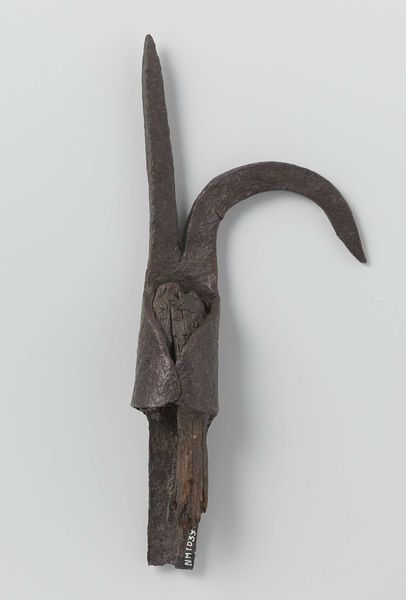 Curator: This object before us is a Short Sword, believed to have been crafted around the 20th century. It's currently held here at the Minneapolis Institute of Art and is attributed to the Ngala or Ngata peoples. Editor: Immediately striking! The blade's crescent shape is both elegant and imposing, with a real sense of weight. It seems less a tool of brute force and more… ceremonial, almost artistic. Curator: Absolutely. The sword is comprised of multiple materials; we see carved wood and metalwork in the handle, leading to a forged steel blade. Looking at it from a production standpoint, consider the collaborative nature of its creation. Did one artisan specialize in metalwork, while another focused on the wood carving, bringing in potential craft guilds and regional specialization to this object? Editor: That thought makes me consider its display and how Western museums often remove objects like this from their cultural context. This isn't merely an object; it's an artifact representing skill, labor and likely ritual. Do we adequately convey that to our visitors? Curator: The craftsmanship indeed is exquisite. Note the details worked into the blade, its smooth crescent-like curve contrasted by that smaller central floral emblem at the converging point above the handle. Editor: I can imagine how this would feature in social ceremonies of all types. How accessible were such materials to its makers and intended users? Could access and usage denote something about the power dynamics of the era? Curator: Such material choices, I think, speak to availability but perhaps also desired status. Were steel blades readily obtainable or prized items, thereby symbolizing the owner's influence within the community? Furthermore, the museum context changes it. Editor: Precisely! Displaying such items out of context presents a narrative of conquest and obscures its integral connection to a community. Curator: It’s thought-provoking how a simple change in context—from communal use to museum display— shifts the reading. Thanks for your input on how social elements influence artistic practice! Editor: The pleasure's been mine! I feel that the history surrounding an item greatly determines the perspective you hold for it.