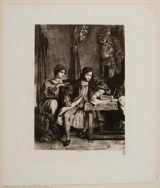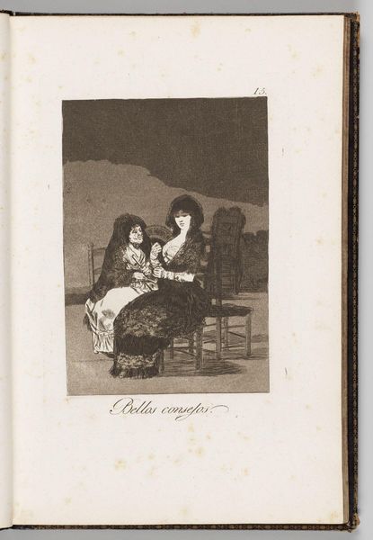 Curator: This is Francisco Goya’s print, “Pretty Teachings,” which can be found here at the Harvard Art Museums. Its etching captures a rather intriguing scene. Editor: Yes, it’s quite stark, isn’t it? The aquatint is so heavy, giving it a shadowy, almost oppressive feel. Is it meant to be ominous, even? Curator: Well, Goya often used imagery to critique social norms. These women, adorned in finery, might represent the superficiality of societal teachings. The dark background could symbolize ignorance or moral decay. Editor: The lace, the fabric--these details, rendered through aquatint, speak volumes about the labor involved, the consumption it encourages. It’s a commentary on class and privilege, wouldn’t you say? Curator: Precisely. Goya uses the visual language of dress and setting to offer a layered critique of the values being passed down through generations. Editor: It’s compelling to consider the material realities that underpin such "pretty teachings." The very process of creating this print highlights the tension between surface beauty and underlying social critique. Curator: Indeed. It’s a powerful reminder of how appearances can both conceal and reveal deeper truths. Editor: A fitting testament to Goya's sharp eye for the human condition.