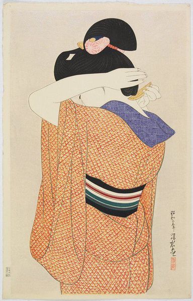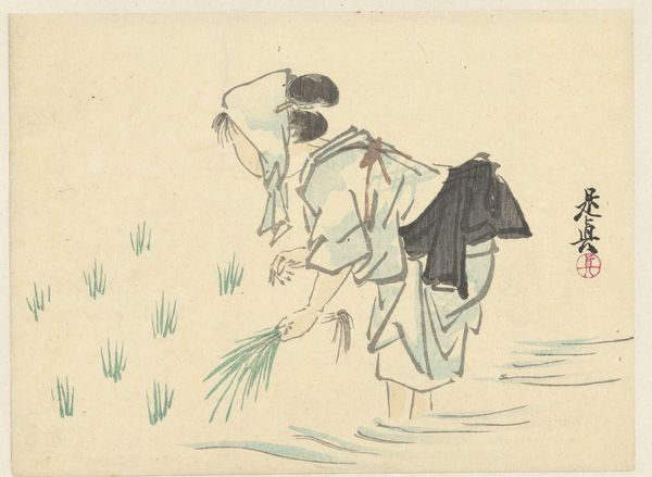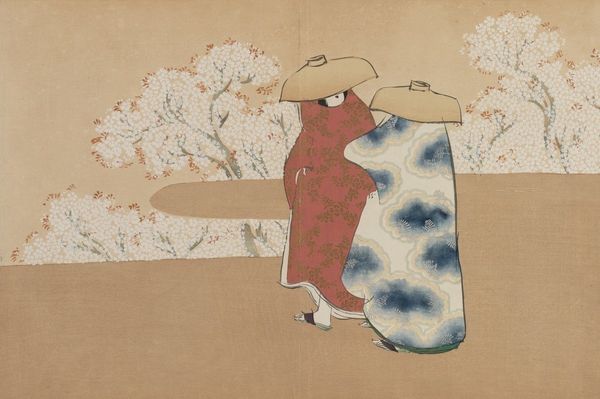 Editor: So, this is *Lente*, possibly from 1909, by Kamisaka Sekka. It’s watercolor and is currently held at the Rijksmuseum. The colors are very soft. It almost feels like looking at a dreamscape or figures in a theatre, but I am not sure what's really happening here. What do you see in this piece? Curator: I see a conscious effort to connect past with present, evoking memories of shared visual experiences. Look at how the artist simplifies form, focusing on shapes and flat color to express depth, much like earlier ukiyo-e prints. Yet, he also integrates influences from Western Impressionism. Do you see the subtle stippling effects in the blossoming trees? Editor: I do, now that you mention it. So it's a sort of synthesis, almost like he’s having a visual conversation between two worlds? Curator: Precisely. It’s this cultural conversation that resonates most strongly for me. Notice, too, the robes of the figures; they're patterned in a way that alludes to traditional motifs while simultaneously breaking from them. This echoes Japan's rapidly changing identity during the Meiji era. Editor: That makes a lot of sense. So, the choice of figures and even the trees themselves – is there some significance to that, as well? Curator: Everything carries meaning. Blossoming trees are loaded with significance – rebirth, transience, the fleeting nature of beauty, very loaded culturally. The figures represent people within these broader themes. Do the hats obscure identity? Is the obscured identity on purpose? Editor: Interesting. I wouldn't have thought about it so deeply. Thanks, it’s amazing to consider how it all interrelates! Curator: Indeed. This image isn't merely a pretty picture; it's a portal to understanding how artists use symbols to make sense of their changing world and their relation to history and cultural memory.