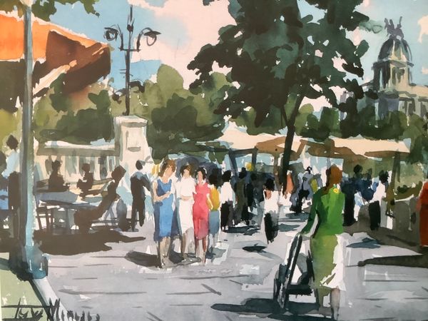 Consuelo Hernández made 'The Lago Station,' a 100 x 150 cm painting, perhaps in recent years, with an even, considered touch. The making feels like a thought-through process, where mark and hue are applied with a plan. The colors are so even, like a wash of diluted acrylics across the canvas. Up close, the surface has an almost chalky texture. Look at the shadow of the figure in the orange top. It’s a dark, almost inky stain that suggests depth but also a certain flattening effect. The cool blues and grays of the station platform meeting the bright blue of the sky gives the piece a sense of endlessness, yet it’s also quite contained. Hernández’s vision has a similar feel to that of Giorgio de Chirico, who made cityscapes imbued with a sense of mystery and alienation. Ultimately, art is not just about what we see, but how we feel, and 'The Lago Station' invites a kind of quiet contemplation.