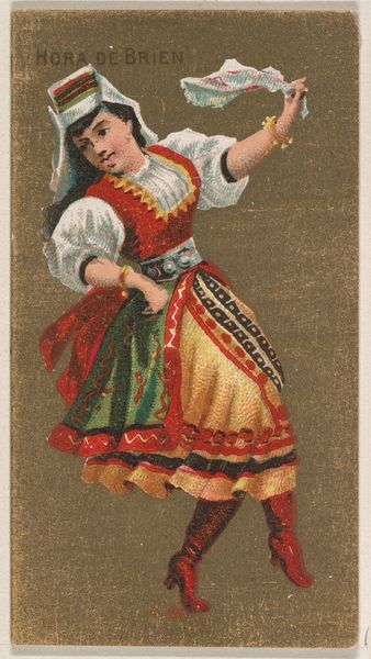 Curator: This small chromolithograph, entitled "Tarantella," comes from a series called "National Dances" issued by the Kinney Bros. Tobacco Company in 1889. The vibrant colours are immediately striking. Editor: Indeed! The motion practically vibrates off the card, doesn't it? There's a clear narrative implication, but also a distinct exoticizing gaze, even within a commercial context. I immediately think about the representation of labor, and who this ‘national dance’ truly represents. Curator: Absolutely. It's fascinating to consider these tobacco cards as a form of early mass media, circulating images and ideas widely. Note how the process allows for incredibly precise registration of color. This required highly skilled labor, often outsourced, particularly for the complex die-cutting required to separate the cards. Editor: And in whose hands did the tobacco itself eventually end up? The imagery of national dance romanticizes global culture and obscures the darker side of the company’s history of distribution and commodification. Consider how dance—usually tied to resistance and cultural memory—is packaged here. Curator: That's right. Consider the material components, too: the paper stock itself, likely produced in large quantities in mechanized mills; the inks, mixed with precise formulas. The company used advanced techniques for reproduction—lithography allowing a wide distribution network to develop. These became collectable commodities in themselves! Editor: This image, like many commercial depictions of women performing “folk dances”, can easily lend itself to stereotypical fantasies. To consume a tobacco product along with the card solidifies both material exchange and potential problematic narratives regarding nation, gender, and ethnicity. I'm left to ponder how far we have truly come from these dynamics. Curator: It's remarkable how such a small, seemingly innocuous piece of ephemera can reveal so much about industrial processes, cultural exchange, and societal attitudes. It forces us to reflect on mass production, distribution networks and social hierarchies. Editor: Yes, absolutely, the politics of representation intersect with the commodification of culture on a grand scale. These cards tell layered and discomforting histories that echo even today.