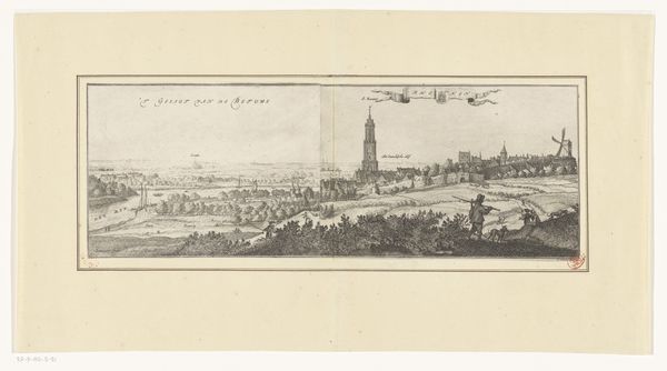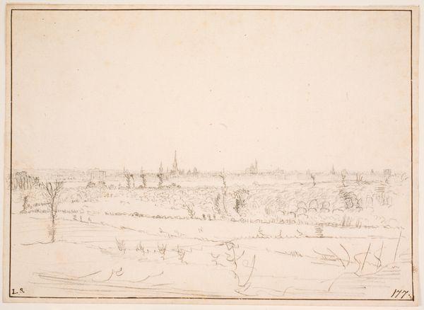 Hendrik Jozef Franciscus van der Poorten made this drawing, whose title translates as “Encounter in the Forest,” using pen in the Netherlands sometime in the first three-quarters of the 19th century. Rather than portraying a forest encounter, the artist has depicted a landscape showing houses and towers. It's a bird's eye view, and the artist creates depth by positioning the skyline far in the distance. By including these urban landmarks, he has created a tension between the natural and the built environment. Such an image would likely be intended for those with an interest in the city's topography. This was a period when printed images were increasingly circulated and consumed by a growing middle class. The developing art market meant there was an audience for such landscape images among those who sought an elevated, aesthetic experience. To understand van der Poorten’s artistic motivations and the drawing’s contemporary appeal, historians might explore the period’s changing urban landscapes and the rising popularity of landscape imagery.