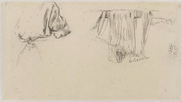 Curator: This drawing by Ferdinand Oldewelt, titled "Studieblad met schapen te Exloo", which translates to "Study Sheet with Sheep in Exloo," dates from approximately 1904 to 1912. It's a sketch, likely from a personal sketchbook. What strikes you first about it? Editor: Well, there's an immediate sense of quiet observation. The muted palette and sketched lines impart this unassuming feeling of an artist capturing a transient moment, like sneaking glances. Curator: The artist was deeply entrenched in the Hague School tradition, you can notice that focus on rural life, the use of subdued tones… What you call 'quiet observation', I see reflected in how artists of this school saw the world and then represented the world. Editor: Exactly. Looking closer, I am also fascinated by the social implications, a conscious focus on agrarian realities. A choice, I presume, meant to acknowledge and dignify laborers that powered society, in a country side that, for its inhabitants, became synonymous of precarity. Curator: Precisely. This focus elevated everyday life and landscapes into significant artistic subject matter, thereby subtly advocating for recognition and social consideration for those often marginalized within rapidly industrializing societies. Editor: And there is something vulnerable and tender, even, in the way he renders these creatures. Notice how he focuses on the sheep's backsides! Almost comically. The composition becomes an exercise in the absurd that deflates romantic visions about rural life. Curator: A fascinating interpretation, that also exposes the political role of art. Considering the prevailing artistic conventions of the time, these compositions showcasing working animals undeniably resonate with contemporary societal discussions. The art market also played its part... Editor: Definitely. Today the work seems to call into question assumptions of value, whether ascribed to labor, art, or any form of existence. I keep feeling as though it challenges viewers to actively grapple with the intersections of aesthetics, power, and social consciousness. Curator: Looking at Oldewelt's broader oeuvre, it reveals a career navigating artistic integrity and market demands—reflecting the evolving dynamics between artistic expression, social representation, and economic realities. Editor: And perhaps we can read today this “Study Sheet with Sheep in Exloo” as an unpretentious testament to the intrinsic value of that very common life, and of our social responsibility in understanding its significance.
