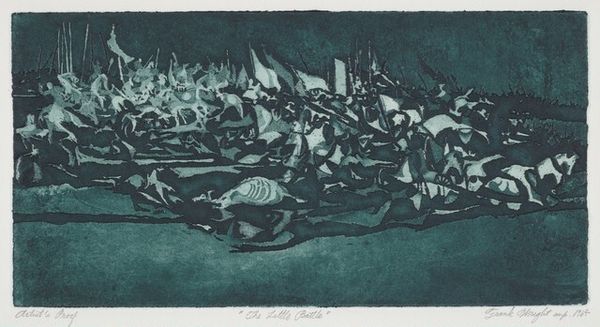 Frank Wright's "The Battle" is a print of some kind, it's hard to tell which exactly, but you can see the impression the printing plate has made in the paper. The horses and riders are a tangle of shapes, like an alphabet or hieroglyphs, maybe, something you can't quite make out. The cool, limited palette gives the whole scene a sense of distance. The textures work together, and your eye jumps from one texture to another. Look at how the horses in the foreground are rendered as almost pure shadow, you can see the negative space between them as a band of light. What's fascinating is how he makes this incredibly complex composition with such a simple set of marks. Reminds me a bit of Goya's looser, more abstract aquatints. Ultimately, Wright's "The Battle" embodies the idea that art is not about fixed meanings but about ongoing conversations.