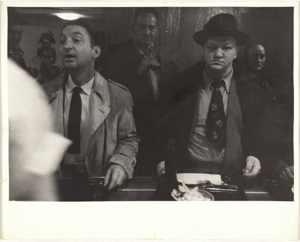 Curator: Dennis Hopper's 1967 gelatin silver print, "Andy Warhol, Henry Geldzahler, David Hockney and Jeff Goodman from "Out of the 60's", captures a fascinating quartet. Editor: The immediate impression is one of guarded cool—a study in the iconography of the 60s art scene, all smoke and obscured glances. Curator: Hopper, himself a counter-culture figure, documents his social circles. The choice of black and white emphasizes the gritty reality of the subjects, as does the way the composition centers on their clothing and the props they use. Editor: The cigarette, the cigar, the glasses... each carefully deployed as a marker of identity, almost totemic. It’s a tableau of artistic identity, each figure a carefully constructed persona. Curator: But how constructed are they? Hopper's work challenges the mass-produced images of celebrity, hinting at the individuals beneath the constructed images. The materials and their arrangement speak to that tension. Editor: And it's a potent reminder of that era's obsession with image and self-presentation, all captured with that documentary-like immediacy. Curator: Ultimately, Hopper’s photograph captures the spirit of a time through the material circumstances of its leading figures. Editor: Yes, a frozen moment of artistic posturing, laden with symbolic weight.