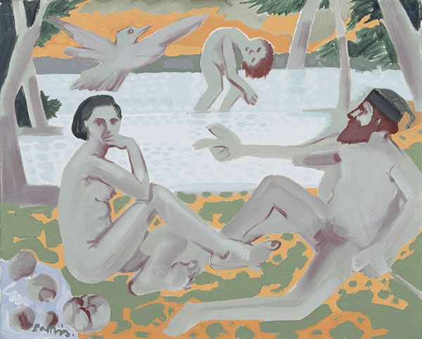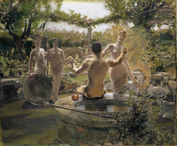 Frederic Bazille's 'Bathers (Summer Scene),' now at the Fogg Museum, presents a tableau of male figures in a sun-drenched landscape, painted in 1869. The composition is structured by contrasts: the cool blues of the water and sky against the warm greens and flesh tones. Bazille orchestrates a play between classical form and modern informality. He challenges the established academic tradition by depicting contemporary figures in leisure, rather than historical or mythological subjects. The arrangement of figures, some languidly posed, others actively wrestling, creates a dynamic tension. This tension destabilizes fixed categories of representation, inviting a re-evaluation of the male nude within the context of modern life. The brushwork is loose, foreshadowing impressionism, yet the underlying structure remains firmly rooted in academic principles. 'Bathers' serves not merely as an aesthetic statement but as a cultural inquiry, questioning and expanding the boundaries of artistic representation.
