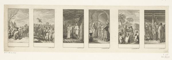 Daniel Nikolaus Chodowiecki made this print, "Two Scenes from Salzmann's Carl von Carlsberg", using etching. The etching presents two distinct images that offer a window into 18th-century social and cultural values. The scene on the left depicts a formal gathering, possibly a religious ceremony, signified by the central figure's ornate garb and the presence of ecclesiastical figures. The second scene, framed in a circle, shows a woman with long hair, a man kneeling before her, suggesting themes of virtue, supplication, or perhaps a moral lesson. Produced in Germany, these images reflect the era's emphasis on moral instruction through art. Institutions like the church and the family played pivotal roles in shaping societal norms, and art often served to reinforce these structures. Chodowiecki's illustrations were likely intended to educate and moralize the public, reflecting the progressive ideas of the Enlightenment while also maintaining the social hierarchy. Studying the prints and books of the time would provide further insight into Chodowiecki’s work, revealing how art was employed to navigate the complex social landscape of 18th-century Germany.