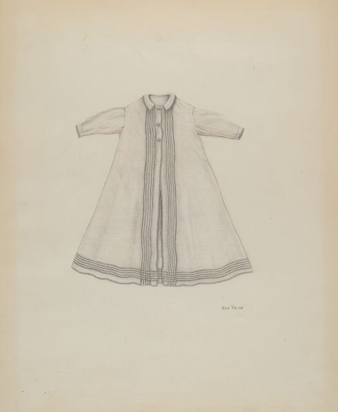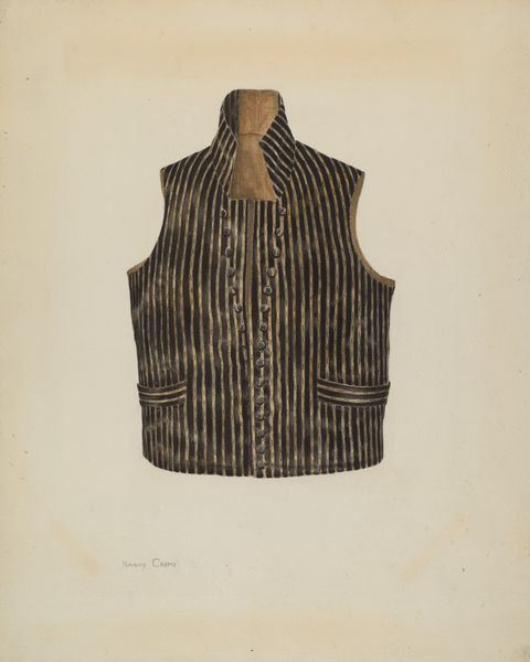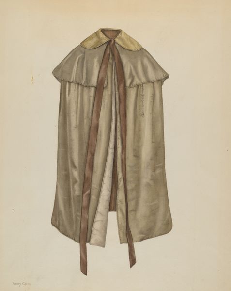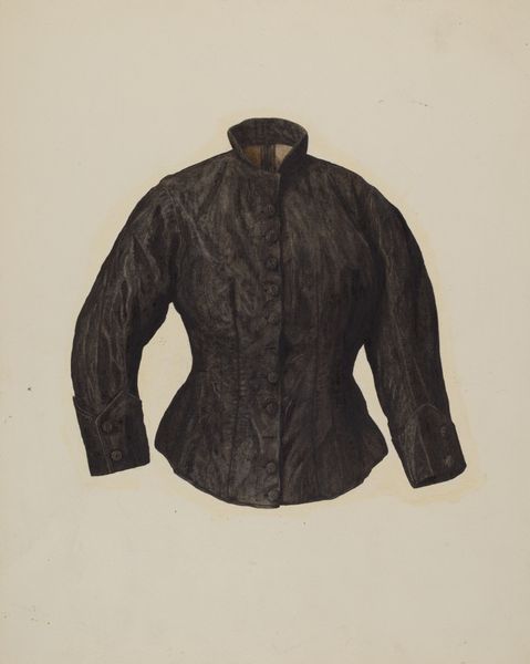 Editor: Here we have Michael Trekur's "Dark Brown Cotton Coat," from around 1935. It's rendered meticulously in colored pencil, isn’t it? There’s something very intimate and precise about the rendering, yet the subject itself is simply an article of clothing. What strikes you about this work? Curator: Well, precisely because it is an item of clothing, it provokes fascinating questions. Who wore this coat? Where was it made? Was the artist examining modes of production and their place in interwar society? What does the act of drawing – the artistic labour involved in reproducing such a mundane object – tell us about artistic practices at this time? The materiality of the cotton and the coloured pencils speaks to larger economic systems. What kind of consumer was supposed to purchase and wear this coat? Editor: So you're saying the image asks us to consider both the labour involved in its creation and the coat's original context? How would this coloured pencil rendering of fabric relate to its mass production and distribution, were that even the case? Curator: Absolutely. This isn’t just a portrait of a coat, but also perhaps of a system. Think about the coloured pencils as well, mass produced, consumed… How do the physical properties of these tools – pigment, graphite – mediate our understanding of clothing manufacture and access? Also, by framing this drawing as academic-art realism, it positions everyday wear like a coat into high art culture. Why do you think the artist made this decision? Editor: It reframes how we value clothing. Thinking of art objects as commodities in the marketplace, this work, initially about an article of clothing, comments back on the commodification of all things, art included. Curator: Exactly. So, considering the artist’s material choices, and the item depicted, it is possible to reconsider preconceived values attributed to 'high' and 'low' cultural forms. Editor: I’ve definitely gained a new perspective on how an image of such a seemingly ordinary thing can speak volumes about production, consumption, and artistic value. Thanks for showing that to me. Curator: Likewise, considering it within this perspective shows how everyday items bear social context, and allows us to question and reflect on the labor they entail, on art, and how we, too, consume all sorts of goods.