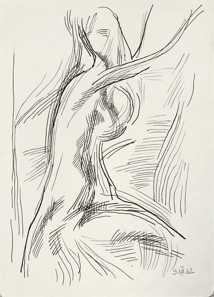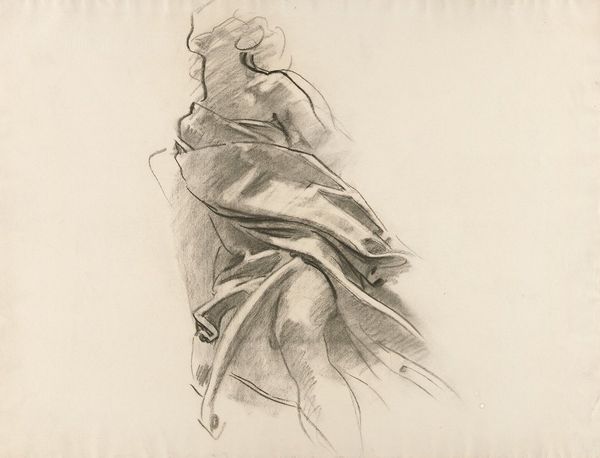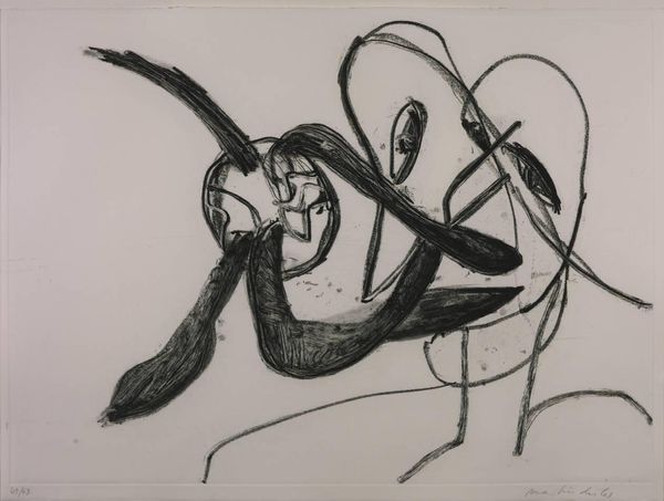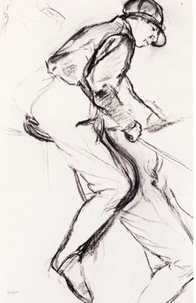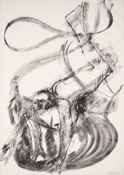 Curator: Dame Elisabeth Frink's "Spinning Man IV" presents us with a study of movement and form in charcoal. Editor: The image immediately strikes me as violent, or at least intensely energetic. The blurred lines give a real sense of motion. Curator: Frink's interest in the male form often explored themes of power, vulnerability, and social conflict. This piece, in its abstraction, could be interpreted as a critique of masculine archetypes and the pressures they face. Editor: Note how the charcoal is applied—thick in some areas, almost disappearing in others. It adds to the sense of something fleeting, a figure almost dissolving. Curator: And perhaps that dissolution speaks to a broader societal anxiety about masculinity. Frink often engaged with the anxieties of her time. Editor: A powerful piece. It really showcases how much can be communicated through line and form. Curator: Indeed. It invites us to consider the multifaceted ways in which masculinity is both constructed and experienced.