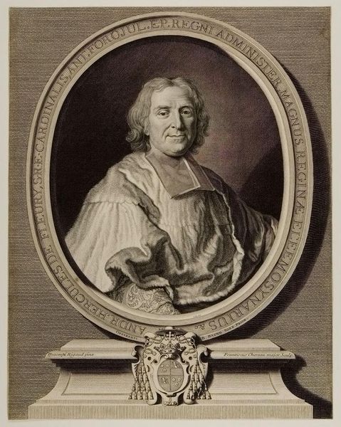 Curator: This is Jacobus Houbraken's engraved portrait of Alexander Pope. He's framed by such elaborate ornamentation! Editor: Yes, there's a dreamlike quality to it, a sense of literary grandeur. Pope looks so pensive. Curator: And the symbols surrounding him amplify that: the putto head, the radiating light, the figures enacting a scene. It speaks to Pope's status as a celebrated figure, almost deified in his time. Editor: It's fascinating how this image serves to both immortalize Pope and project the cultural values he embodied—reason, wit, and a connection to the classics, made visible through symbols. Curator: The visual language certainly elevates him beyond a simple likeness. The weight of cultural memory is all here. Editor: Indeed, it's a powerful statement about the role of artists and intellectuals in shaping society's narrative. Curator: I'll never see Pope the same way again! Editor: That's the power of art, isn't it?