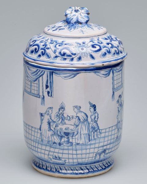 This covered jar, found at the Minneapolis Institute of Art, presents a domestic scene in delicate blue and white. The floral motifs adorning the lid are not mere decoration. Flowers throughout art history have been linked to the transience of life and love, but also the eternal cycle of seasons. Consider the depiction of a window with draped curtains in the body of the jar. In Renaissance painting, windows often symbolize insight and awareness, yet the curtain adds a layer of intrigue and concealment. This use of the window can be seen reappearing in Dutch Golden Age painting, where an open or partially curtained window framed genre scenes of domestic life, implying both revelation and voyeurism. Such representations tap into our collective memory, stirring subconscious desires to understand the hidden narratives of everyday life, suggesting a universal longing to look beyond the surface. The meaning of these symbols is not fixed, but evolves, as these symbols resurface, taking on new meanings in different contexts, continuously influencing how we perceive our world.