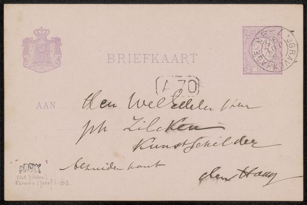 This is a briefkaart, or postcard, sent by Jozef Israëls to Philip Zilcken, likely towards the end of the 19th century. While seemingly a humble artifact, the postcard speaks volumes about the changing landscape of communication and labor at the time. Printed on thin card stock, the briefkaart is an early example of mass communication, facilitated by advances in printing technology and postal systems. The use of standardized formats, pre-printed text, and adhesive stamps streamlined the process, reducing the cost and effort required to send a message. Israëls’ handwritten note connects the world of fine art with this burgeoning culture of efficiency. The quick, informal script contrasts with the more formal printed elements, reminding us that the aesthetics of craft and automation often overlap and intersect. Consider how even everyday materials like paper and ink can tell us about broader social and cultural shifts. It challenges the distinctions between high art and everyday life.