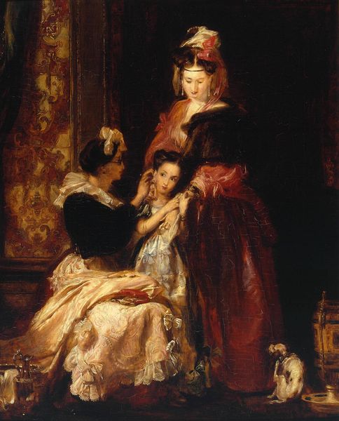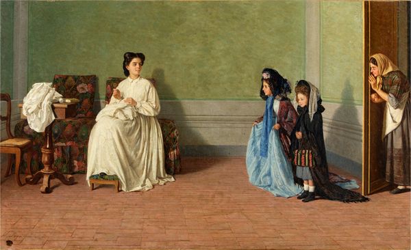 Gerolamo Induno created this painting, “He is sleeping!” in the late 19th century, a period characterized by significant social changes in Europe. Induno, who participated in the Italian independence wars, often depicted scenes of everyday life, infused with subtle social commentary. Here, we see two women attending a sleeping infant in an ornate cradle. The setting suggests a prosperous household, yet the dynamic between the women hints at more than domestic tranquility. One woman looks pensively at the child with a melancholic expression, while the other is sewing, perhaps indifferent to the first woman's mood. Consider the constraints placed on women during this era, where their roles were largely confined to the domestic sphere. Induno subtly captures the emotional landscape of women bound by societal expectations, while also drawing attention to the labor often unseen and unacknowledged. "He is sleeping!" thus becomes a window into the complex realities of 19th-century womanhood, reflecting both its comforts and its discontents.