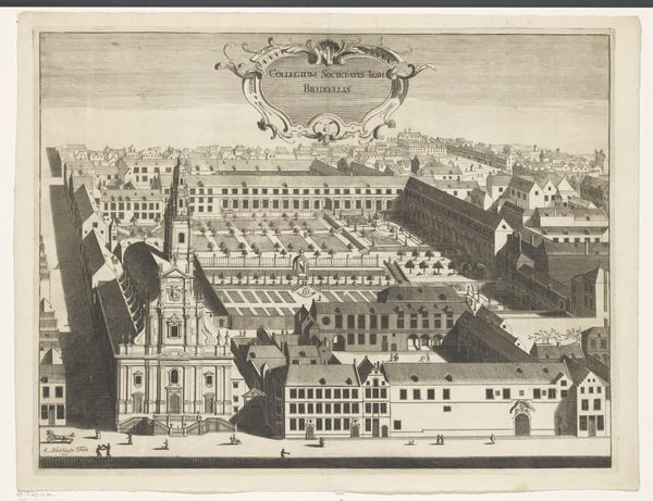 Curator: Allow me to introduce "Dominicaans klooster te Antwerpen," or "Dominican Monastery in Antwerp," created in 1661 by Lucas (II) Vorsterman. It's a detailed print showcasing the monastery. Editor: My first impression is that it feels like a blueprint, but with artistic flair. The composition leads your eye through the complex, and the level of detail is captivating. It’s impressive, architecturally, how he's created such clarity. Curator: Indeed. It's a masterful use of engraving and etching, mediums that were becoming increasingly sophisticated. The lines, etched or engraved with precision, delineate the architectural structures, garden layouts, and even human figures, revealing a specific level of labor and skill that reflects societal values around craft at the time. Editor: The perspective is fascinating. It is as if you're floating above, observing this enclosed world. I note how light and shadow are deployed, especially around the central church façade, creating depth and emphasizing its grandeur. Curator: And that is a direct consequence of Vorsterman's understanding of optics. The print offered viewers a chance to "possess" or survey urban development in a new way. This ability to reproduce and distribute views of urban space held considerable political and social implications, especially in the rapidly expanding mercantile society of Antwerp. Editor: The inclusion of human figures, albeit small, offers a sense of scale. Semiotically, these little people ground the imposing structure, connecting the divine with the everyday world. Note, too, how his choice of line quality, sometimes delicate and other times firm, affects the overall impression of solidity. Curator: Absolutely. It speaks volumes about accessibility and power too. Imagine how such prints made spaces and places more available to be consumed by wealthy patrons who never even visited the monastery. In terms of its function as art and a commodity, such reproductive technologies were important because they offered consumers a window onto a reality they might not otherwise experience, thus playing a vital role in shaping cultural attitudes about the city. Editor: Seeing this today reminds me that this isn't just a picture but an idea about urban planning and order. It's a Baroque ideal realized. I leave today thinking about all the various production layers required to accomplish this print. Curator: I agree, and perhaps, even more importantly, of what kind of consumption its reproduction promoted.