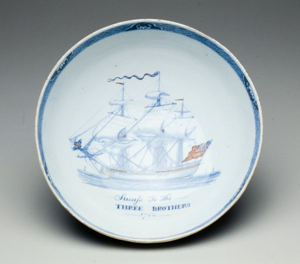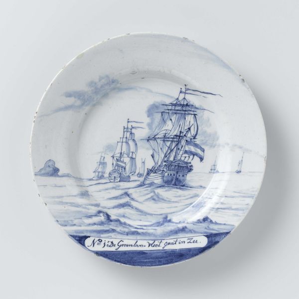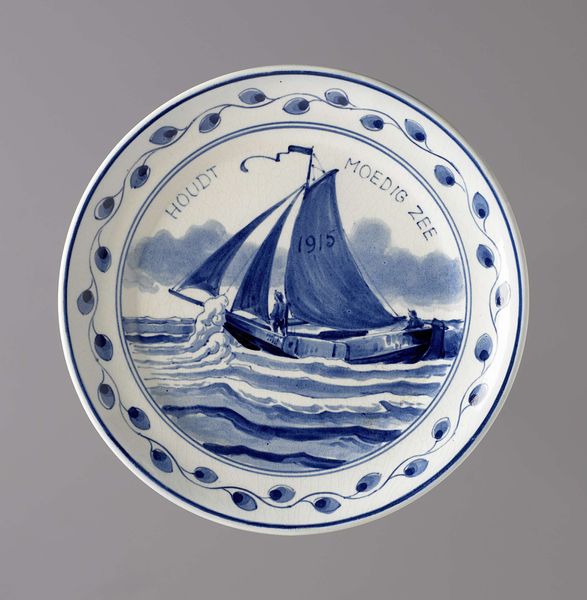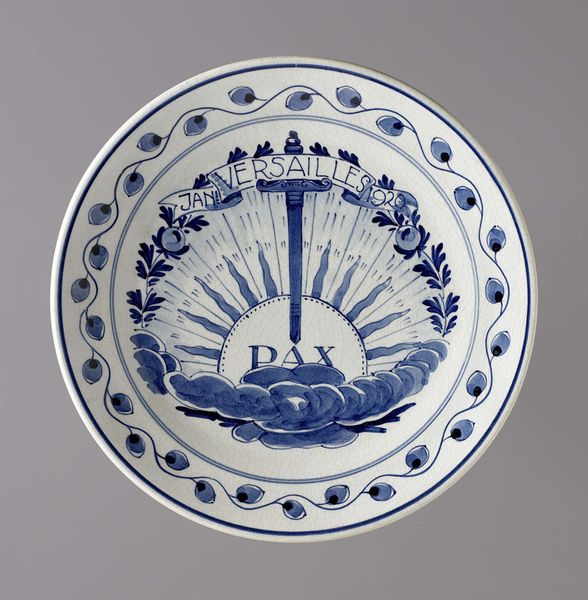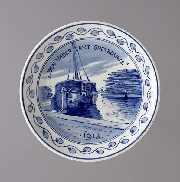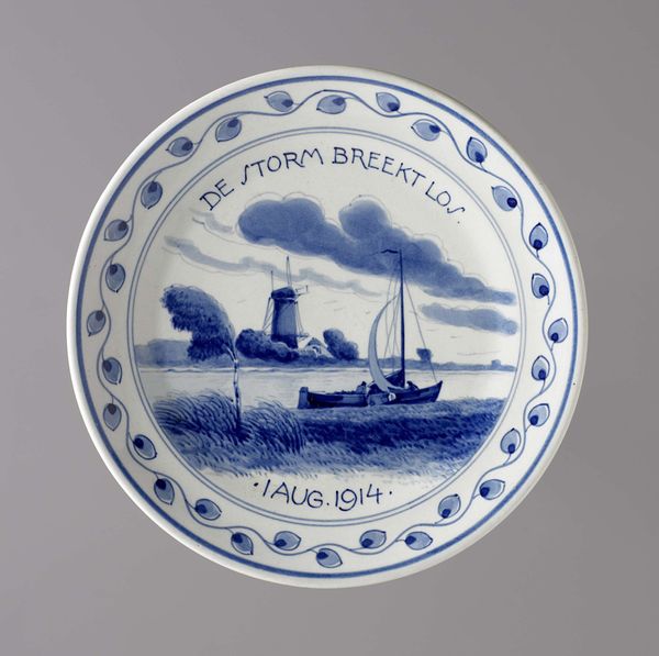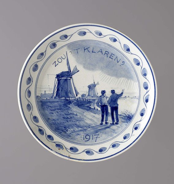 This Delftware plate, made by De Porceleijne Fles, is a study in circular composition and tonal variation. Its cobalt blue imagery against the stark white ground presents a serene, yet structured tableau. The circular form is echoed in the central image framed by text above and below. The central image depicts a windmill rising from a field, flanked by smaller buildings and trees beneath a cloudy sky. The artist uses varying densities of blue to create depth and dimension. Notice the border: a continuous chain of stylized leaves; each element contributes to the overall harmony. The use of text and image suggests a semiotic interplay where words and visuals combine to convey meaning. The plate’s circular structure and balanced composition invite contemplation, suggesting a world in harmony, carefully ordered by design. As you observe the continuous flow of the border and the integrated imagery, consider how this plate, beyond its practical function, embodies a cultural and philosophical statement about order, representation, and the human relationship with the environment.