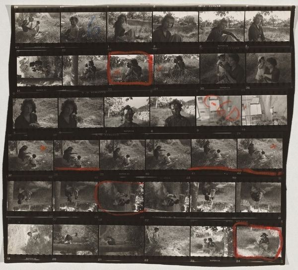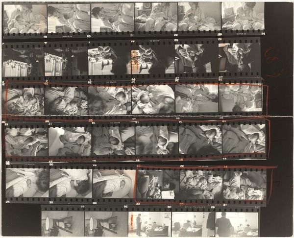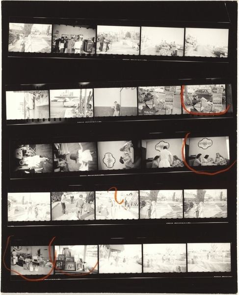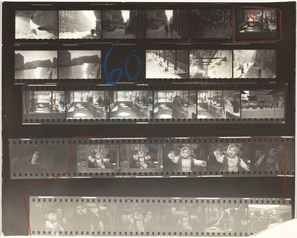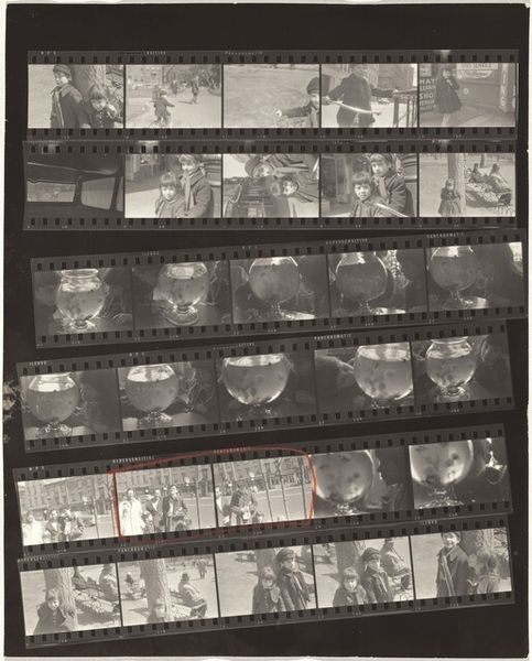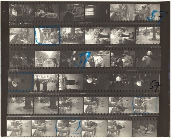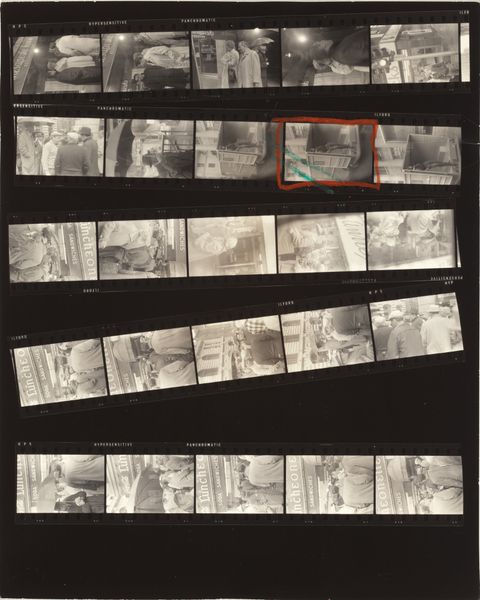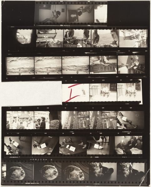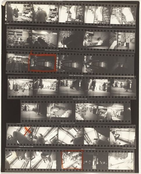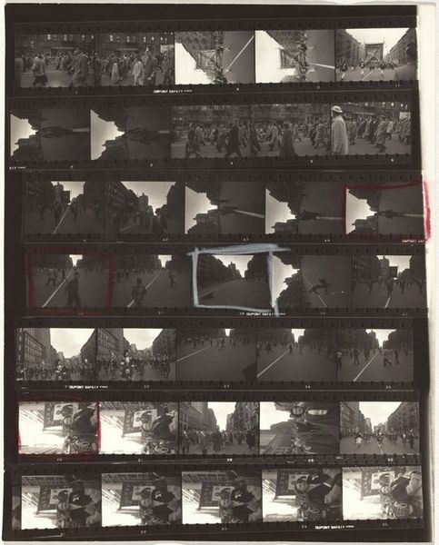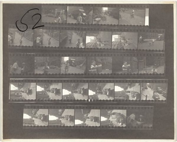 Editor: This is Robert Frank's "11th Street Story 31" from 1951, a gelatin silver print showing rows of images. It's like a storyboard, hinting at narratives. What strikes me is the raw, documentary feel, even a bit voyeuristic. How do you interpret this work, considering the context of its time? Curator: Well, Frank's work often reflects a sense of displacement and observation within post-war America. Here, the contact sheet format reveals not just the 'decisive moment' but also the process, the surrounding 'failed' moments. It pushes us to question what stories are being told and who is given the authority to tell them. Consider who is seen and how. Do you see a diversity of representation or a limited view? Editor: I see primarily figures in an urban environment, and everyone seems to be white. Were other realities intentionally excluded, or perhaps just unseen by Frank? Curator: Exactly. That limitation is significant. Frank's perspective, while seemingly objective, is inherently shaped by his own identity as a Swiss immigrant navigating American society. How might his outsider status influence the gaze he casts upon these cityscapes? What is he drawn to, and what might he overlook? His street photography reflects his outsider status while potentially reinforcing existing power structures of representation. Editor: That makes sense. Seeing this as a conscious or unconscious statement on belonging and exclusion offers a much deeper understanding. I initially saw it as simply observational, but it's far more complex than that. Curator: Indeed. Frank prompts us to critically examine not just the content of the image but also the photographer’s role in shaping the narrative. Art like this reminds us that "objectivity" is often a myth and that every image is a product of social and historical forces. Editor: I'll never look at street photography the same way again! It's all about questioning who gets to look and who gets seen.