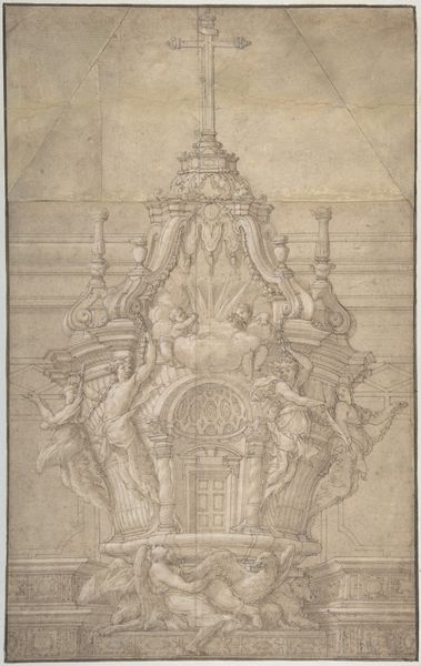 Curator: Here we have an intriguing pen and ink drawing, "Drawing for a Palace Decoration," created sometime between 1700 and 1800 by an anonymous artist. It's currently held here at the Metropolitan Museum of Art. Editor: The starkness of the black ink on paper is what hits me first. There’s almost a blueprint quality to it, like looking at the plans before the grand thing itself takes shape. Curator: Precisely. The meticulous line work captures the essence of Classicism. It reflects the formal language and visual vocabulary of power that permeated European court culture. Note how architectural elements intertwine with figurative sculpture. This drawing served a very specific purpose within that system. Editor: Absolutely, and I find it fascinating to think about the physical labor embedded within this image. From the making of the paper itself, likely from rags, to the mixing of the ink, probably from gall nuts. Each decision reveals the resources and means available at the time. Look at those drapes – imagining replicating that level of ornamentation today… it’s a different world of production altogether! Curator: Indeed. Think of the hierarchies this artwork implies, those it represents, and those it bolsters. The creation of palace decorations reinforced established social orders, solidifying the position of the monarchy through carefully curated displays of wealth, refinement, and supposed divine right. It’s also important to acknowledge it through art's public role and imagery in the political process. Editor: While admiring the overall visual effect, I'm struck by how fragile these materials are – paper and ink. A potent reminder of the tension between aspiration and impermanence of even the most opulent symbols. How fleeting our own endeavors might be, framed against such a history. Curator: A keen observation. Reflecting upon this drawing, one recognizes that even designs, intended to symbolize enduring authority, become artifacts shaped by time and circumstance. Editor: Thinking about it further, you see more clearly how its physical reality, this arrangement of ink on paper, links it back to those conditions.