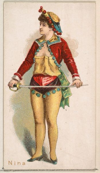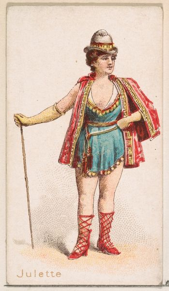 Editor: So this little print, "Rosita," from the Ballet Queens series by William S. Kimball & Co., is from 1889, done with coloured pencils – though, it’s kind of hard to believe it's a drawing. It looks more like a flattened-out, slightly off-kilter photograph. The dancer has this determined gaze... a little unsettling, maybe? What's your take on it? Curator: Unsettling is spot-on! It reminds me of a dream—vivid, but not quite real. Those vibrant reds and blues… almost violently cheerful, right? The artist has certainly captured something raw. There's a tension between the overtly feminine ballet theme and Rosita’s rather warrior-like pose with the spear. Does it strike you as empowering, ironic, or perhaps something else? Editor: I think it's the spear, actually. Without it, she'd be… just another image, right? With it, she feels almost defiant. What were these Ballet Queen prints for anyway? Was it art for the masses? Curator: Precisely! These prints were inserted in cigarette packs. The goal was to entice customers. Think of them as tiny collectible fantasies – accessible art for ordinary folk. It makes me wonder: did people reflect on this, seeing Rosita between drags, building narratives about who she might be? This collision of art, commerce and everyday life…it’s brilliantly weird! Editor: Cigarette cards! It completely recontextualizes my perception, they could almost be compared to trading cards. That sort of... cheapens? them? Curator: Or maybe it elevates them. The setting brings new relevance to those lost cultural gems, infusing everyday acts with narrative and imagery. Imagine collecting a ballerina whilst also perhaps succumbing to an addiction... It reveals so much about what people desired and what they valued! Editor: Wow, I'll never look at cigarette cards the same way again. Thanks for making me see so much more in this seemingly simple drawing. Curator: The pleasure was all mine! It reminds us that beauty hides in unexpected places, waiting for someone to notice and tell its story.