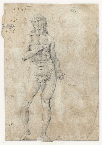 Curator: Here we have Jacopo Pontormo’s “Christ Seated, as a Nude Figure” rendered in pen and charcoal around 1526. It’s currently held in the Uffizi Gallery, in Florence. Editor: It has this somber feel, almost melancholic. The red chalk gives it warmth, but the slumped posture and closed eyes communicate resignation, a weariness of sorts. Curator: Absolutely. The materiality, specifically the chalk, is crucial here. It allows for incredibly subtle tonal gradations and delicate linework that capture the soft modeling of the figure. Look at how Pontormo uses hatching to define form and shadow, creating a dynamic sense of volume. Editor: Yet it's a Christ devoid of triumph, or even of narrative urgency. We're used to seeing the Passion represented with theatrical agony, and this drawing invites reflection on themes of male vulnerability. I would consider how that choice perhaps allows a deeper, more internal sense of Christ's suffering to manifest. Curator: That's precisely where its Mannerist qualities shine, a move away from Renaissance idealism. Instead of striving for perfect anatomical correctness, there is slight elongation and distortion in the figure's proportions to achieve expressive and emotional effect. It really demonstrates the stylistic dynamism that permeated Florentine art circles during this period. Editor: I also think about the absence of context. Is this Christ before, during, or after the crucifixion? He's presented raw, unidealized, vulnerable... It forces a more personal engagement than typical representations allow. This lack of clarity is quite subversive given its overt subject matter, as it seems to question institutional control over his likeness. Curator: True, yet to understand the work fully, we also have to consider the artistic dialogue within which Pontormo was operating, its conscious play with anatomical ideals of the time. Editor: It is a truly humanistic and compelling piece—both artistically daring and historically relevant—in its challenging of those ideals, whether those pertain to politics or the body. Curator: Indeed, I hope that analysis will have deepened the appreciation of it as more than a drawing. Editor: Agreed, It invites a consideration of the individual's humanity when the narrative has, for so long, focused primarily on the deity.