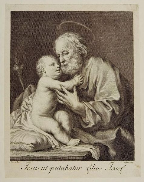 Johann Elias Ridinger created this image of Joseph with the Christ Child using the technique of mezzotint. This printmaking process involves roughening the entire plate, then selectively burnishing areas to create lighter tones. Look closely, and you can see the rich, velvety blacks that are characteristic of mezzotint. This effect is achieved through the labor-intensive process of uniformly burring the plate with a tool called a rocker. The artist then works back into this texture, smoothing areas to create the image. Mezzotint was highly valued for its tonal range and ability to reproduce paintings. It demanded skill and time, reflecting a significant investment of labor. In this context, it is interesting to consider the subject matter: Joseph, a humble carpenter, now rendered with such careful and painstaking labor. Considering the materials and making of this artwork allows us to understand the cultural value placed on skilled work, and also to appreciate the irony of depicting simple virtues through complex means.