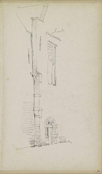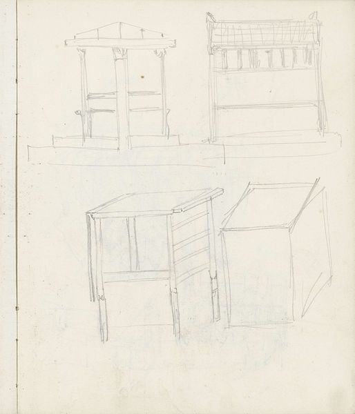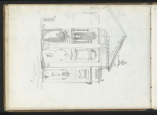 Curator: This is a drawing titled "Architectuurstudie, mogelijk een poort of gevel," or "Architectural Study, Possibly a Gate or Facade," made with pencil on paper by George Hendrik Breitner between 1880 and 1882. It is currently held at the Rijksmuseum. Editor: My immediate impression is of something fragmentary and fleeting. It has an airy, almost unfinished quality. It invites you to complete it with your imagination. Curator: Indeed. This drawing offers an intimate glimpse into Breitner's artistic process. We see him wrestling with form, line, and composition. Note how the rapid lines give an urgency and spontaneity, typical of Impressionist sketches intended for private study. Editor: I’m particularly struck by the doorway, or the suggestion of one. Arches throughout history symbolize transition and potential. This one looks more provisional. Almost like a portal not yet fully formed, between the mundane world and artistic possibility. Curator: Fascinating take. Breitner's urban sketches often focused on working-class life in Amsterdam and his portrayal of the urban environment was pioneering. Consider that Breitner studied at the Rijksakademie during this period. Editor: Yes, and I imagine Breitner quickly sketching details from life during his studies, gathering visual fodder to then build a wider social narrative. There is some ornamental geometry there at the base too which suggests to me, an influence from some historical or period reference that would then add more depth. Curator: Precisely. There are also historical and socio-political factors to bear in mind. The 1880s were a period of intense urban expansion and industrialization in Amsterdam, marked with both promise and social inequalities, issues Breitner documented with his paintings. Editor: You know it gives you a keyhole into both, Breitner's intellectual journey, his education, and his creative method that reflected the city he chose to depict through an intimate observation of form. It makes this little piece here such an emotionally, historical point to reflect back on and observe. Curator: Indeed. It also serves as a reminder of the artist's commitment to capturing not only the physical appearance of the city but also its spirit and social realities. Editor: The power of suggestion, right? A doorway, a hint of a facade. Breitner doesn’t dictate but inspires our perspective with something unfinished. It will linger.