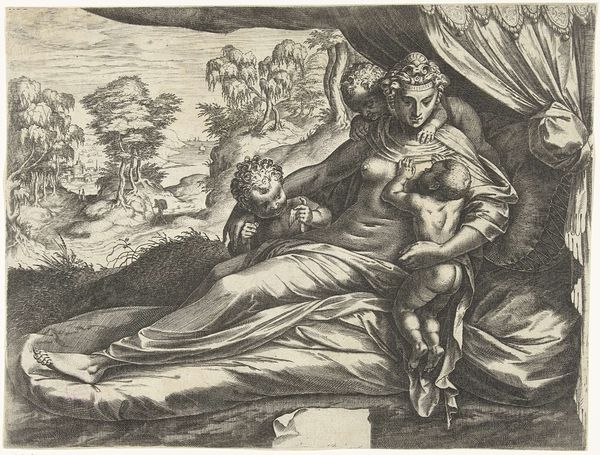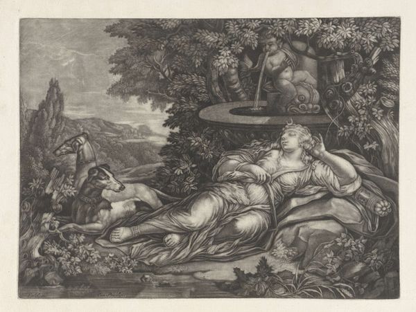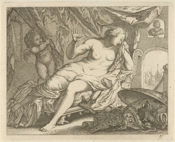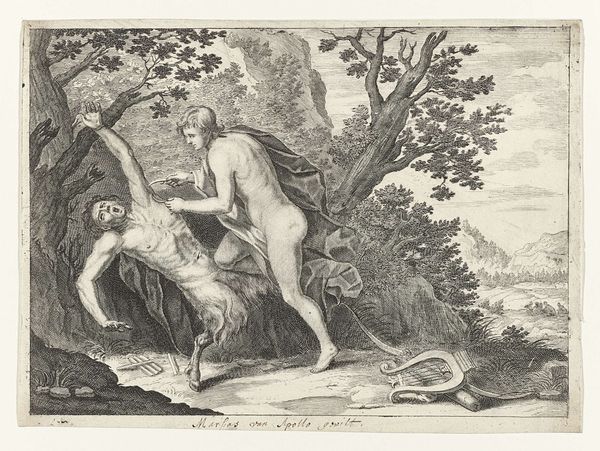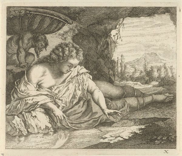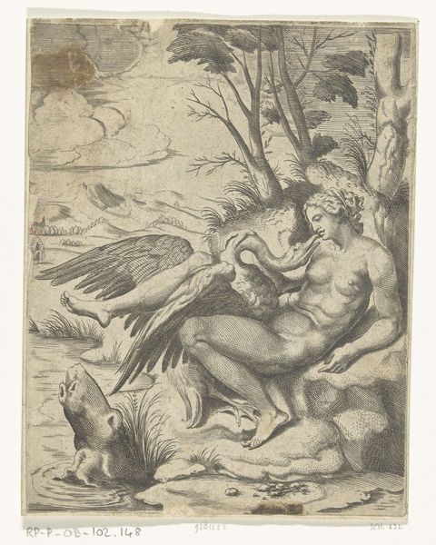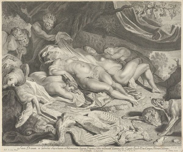 Curator: Here we have an engraving from between 1700 and 1750, titled "Wellustige sater bij een nimf," currently residing at the Rijksmuseum. It's attributed to an anonymous artist. What strikes you about it initially? Editor: The stark contrast grabs me. A luminous, almost idealized female nude is juxtaposed with this dark, coarse figure of the satyr. It feels inherently unsettling, even with the baroque aesthetic. Curator: The symbolism is indeed heavy here. The satyr, of course, represents base desire, untamed and animalistic. His dark form looming over the nymph is meant to trigger ideas of vulnerability and the loss of innocence, and perhaps allegory for civilization versus raw nature. Editor: It makes me consider the means of its production. Look closely at the lines: they're precise, deliberately etched. The engraver's labor brought forth this interplay of light and shadow, desire and apprehension, for popular consumption. How might the viewing public, newly acquainted with reproducible images, interpret it, and did it further codify certain ideals of gender and desirability? Curator: It's impossible to ignore the period context, particularly with respect to depictions of women. This work can also evoke classical themes of temptation. Notice the fabric, draped artfully, suggesting modesty even in nudity. How much agency, if any, does this nymph possess within the allegorical encounter? Or is she simply a representation of idealized purity defiled? Editor: I'm struck, too, by the relative availability of printed works versus unique paintings for consumption at the time. This piece presents what was, at the time, state-of-the-art in mechanical production. These multiple and mobile prints introduced sophisticated ideas to many patrons that would have not otherwise encountered them, but which reinforced contemporary concepts through wider viewership. Curator: It definitely offers a complex web of social, material, and psychological interpretations. Thank you. Editor: A truly striking commentary. The artistic rendering of allegory and the processes behind making such works both help us contextualize a time period, while inviting new interpretations, thanks to changes in modern societal values.