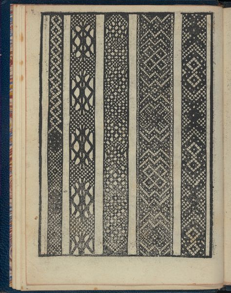 Curator: This is a page from "Le Pompe: Opera Nova," specifically page 11 recto, a book of lace patterns produced by Giovanni Battista and Marchio Sessa in 1557. It resides in the collection of the Metropolitan Museum of Art. Editor: Intricate. I’m immediately struck by the delicacy of the designs, how finely the woodcut is executed. It gives the impression of actual lace, surprisingly light despite the medium. Curator: These pattern books played a crucial role in the social lives of Renaissance women. They provided templates for lacemaking, an essential skill linked to female virtue and domestic economy. The act of creating lace wasn’t just functional; it was a way for women to participate in visual culture, influencing fashion and status. Editor: Absolutely. Think about the labor embedded in this seemingly simple design. Each pattern represents hours upon hours of meticulous handwork – the selection and preparation of thread, the intricate knotting and weaving. This book offered a means of distributing both skill and taste more broadly. These weren’t simply passive instructions; they shaped the agency of female labor. Curator: Precisely! And it speaks volumes about how printed books mediated social behavior. These were not high art, but they circulated widely, informing what the fashionable elite wore and what ordinary women could aspire to create. They exemplify the blurring lines between art, craft, and commerce in the Renaissance. It challenges what we deem important culturally when discussing Renaissance artwork. Editor: I see what you mean about that blending of class through a shared material culture. You have the artist who created the print; and the lacemakers bringing these patterns to life, shaping a more collaborative artwork in a way, each depending on the other. It seems less about expressing pure originality, and more about shared taste across an array of makers. Curator: Right! And looking at the patterns themselves—the repeating motifs, floral elements—they tell us about broader design sensibilities of the period. There’s a language of ornamentation at play here. What can seem simple reveals the material life in a wider context. Editor: Reflecting on it now, what appeared visually delicate hints at a complicated, collaborative construction between printer, lacemaker, gender, and class, something truly material to consider. Curator: Yes, these ornamental prints, despite their seemingly humble status, had the power to shape visual culture and contribute to women's participation in artistic production in the Renaissance. A pattern for the ages.