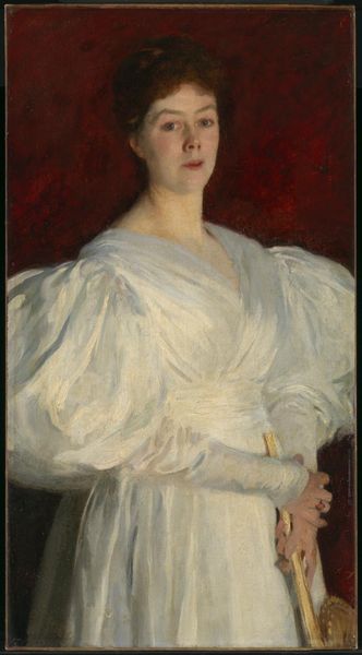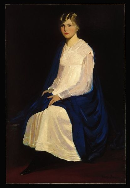 Curator: This is Robert Henri's "The Masquerade Dress," painted in 1911 using oil paints. Editor: It’s arresting. There’s a haunting quality to her direct gaze, and that pale yellow dress seems to glow against the darker backdrop. It feels romantic, almost ghostly. Curator: Indeed. Henri was quite interested in capturing the spirit of his sitters, often portraying them in these kind of posed, theatrical moments. Notice how the costume becomes almost as important as the person. Dresses during this period weren't merely fabric, they were signifiers. Editor: Absolutely. Look at the detail. You can see how the paint is applied in broad strokes, really emphasizing the textures and weight of the fabric. That golden trim at the top and around the arms really pulls the eye and speaks to its precious nature. Curator: And think about the context. Masquerades were social events steeped in symbolic ritual. By entitling it "The Masquerade Dress," Henri is hinting at a narrative, a performance of identity. Who is she pretending to be? Editor: It also forces us to question the labor and materials involved. Someone designed this dress, sewed it, embroidered it—layers of craft consumed for an evening of illusion. Curator: Precisely. The figure, particularly the costumes, become powerful signs with embedded historical and cultural meanings. Editor: I keep thinking about the consumption, the sheer material investment into presenting oneself in this particular way. What does it say about value in the Edwardian period? Curator: A lovely painting to unpack how garments hold meaning. The symbols tell a silent narrative. Editor: Exactly! A quiet and thought-provoking commentary on class and craft. I’m left wondering what sort of work was behind this artwork as well!
